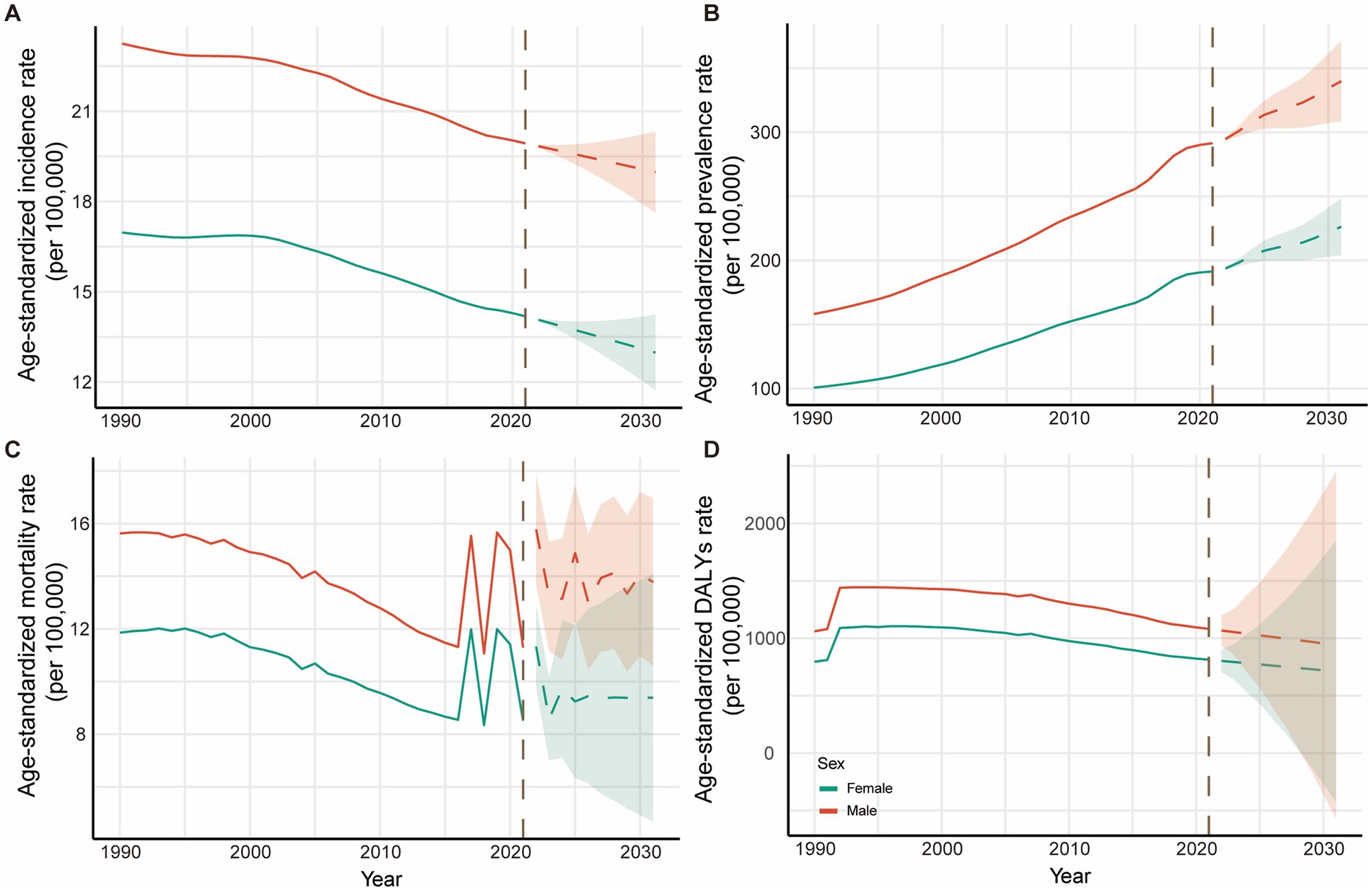 The incidence rates are projected to continue declining for both sexes, with males decreasing from 19.93 per 100,000 (95% UI: 19.67 to 20.24) in 2021 to 18.98 per 100,000 (95% CI: 17.63 to 20.32) by 2031, and females from 14.18 per 100,000 (95% UI: 13.88 to 14.51) to 12.98 per 100,000 (95% CI: 11.72 to 14.24) over the same period (Figure 5A; Supplementary Table S3). Conversely, prevalence rates show projected increases for both sexes, with males rising from 291.46 (95% UI: 253.38 to 330.70) per 100,000 to 339.83 per 100,000 (95% CI: 308.35 to 371.32) and females from 191.38 per 100,000 (95% UI: 166.48 to 216.29) to 226.25 per 100,000 (95% CI: 203.98 to 248.52) (Figure 5B; Supplementary Table S4), reflecting the survival paradox where improved acute care leads to increased numbers of survivors with long-term disabilities. Mortality rates demonstrate a concerning projected reversal of the historical declining trend, with males projected to rise from 11.29 per 100,000 (95% UI: 9.37 to 13.36) to 13.78 per 100,000 (95% CI: 10.60 to 16.95) and females from 8.51 per 100,000 (95% UI: 7.13 to 10.06) to 9.38 per 100,000 (95% CI: 4.67 to 14.09) (Figure 5C; Supplementary Table S5). DALYs rates are projected to continue their declining trend, from 1,081.96 per 100,000 (95% UI: 911.78 to 1257.95) in 2021 to 941.66 per 100,000 (95% CI: −568.23 to 2451.55) by 2031 for males and from 813.53 per 100,000 (95% UI: 697.46 to 951.16) to 710.76 per 100,000 (95% UI: −427.82 to 1849.35) for females (Figure 5D; Supplementary Table S6).
