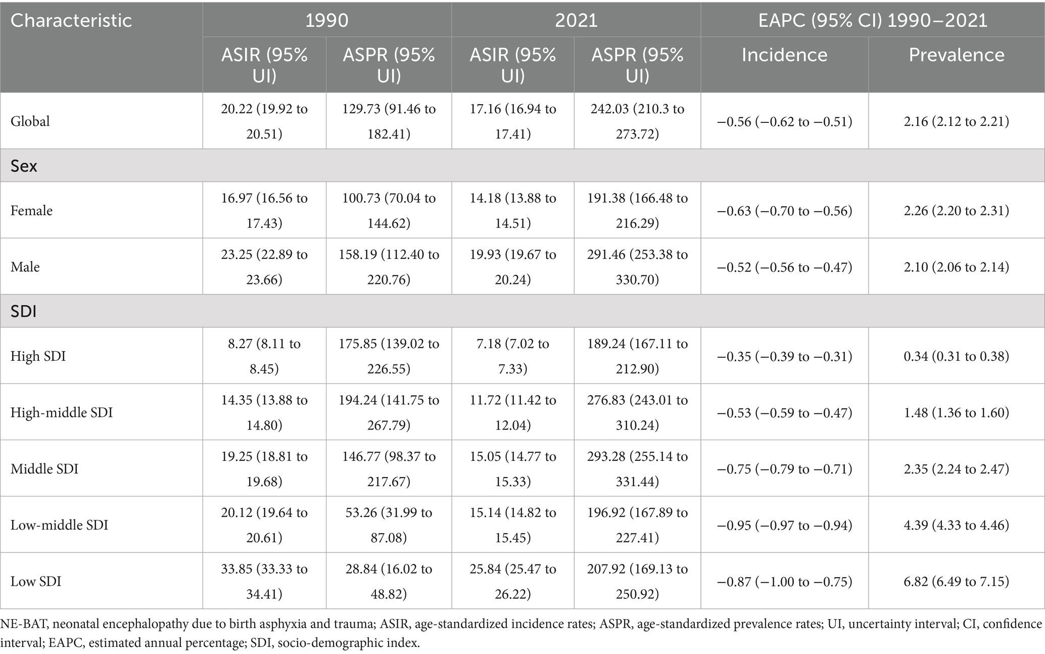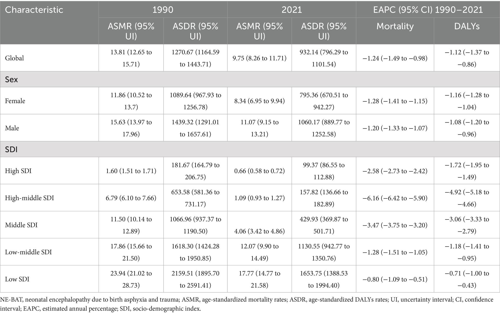 ASDR, Age-standardized DALYs rate; ASIR, Age-standardized incidence rate; ASMR, Age-standardized mortality rate; ASPR, Age-standardized prevalence rate; ARIMA, Autoregressive integrated moving average; CI, Confidence interval; DALY, Disability-adjusted life year; EAPC, Estimated annual percentage change; GBD, The global burden of disease; NE-BAT, Neonatal encephalopathy due to birth asphyxia and trauma; SDI, Socio-demographic index; UI, Uncertainty interval.