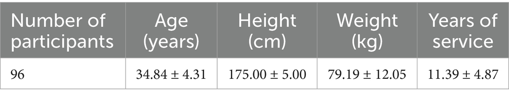 This study selected a total of 96 mine rescuers from the National Mine Emergency Rescue Datong Team (including the Pingwang, Tongfa Dongzhou, Yanya, Sitai, Luyang, Beixinyao, and Madaotou teams) as the subjects for testing. All participants are healthy individuals without acute injuries to the upper limbs, lower limbs, or trunk, ensuring their ability to participate in the tests and minimizing any potential interference from injuries or illnesses in the research outcomes. The subjects are all male, and each participant has previous experience in frontline rescue operations, providing a strong representation for the study. Basic information about the participants is presented in Table 1.