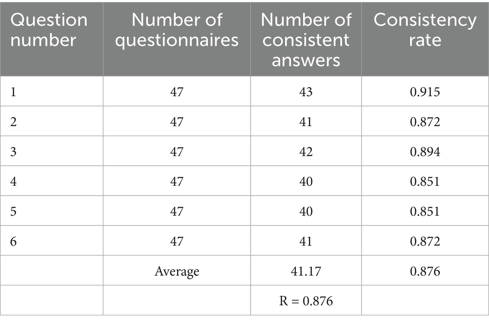 To ensure the reliability of the questionnaire results, a retest of the injury history questionnaire was conducted 2 weeks later with a total of 51 team members who had reported an injury. The questionnaire consisted of 6 questions, and participants answered according to the same procedures and protocols. Subsequently, the responses to the 6 questions were analyzed for test–retest reliability, and the average test–retest reliability coefficient (R) was calculated. A total of 51 questionnaires were distributed for the retest, with 50 returned. After excluding 3 invalid questionnaires, 47 valid retest questionnaires remained, resulting in a response rate of 94.00%. As shown in Table 2, the overall test–retest reliability of the questionnaire was 0.876, with each individual question demonstrating a test–retest reliability higher than 0.85. This indicates a high level of reliability, suggesting that the data is both authentic and reliable, making it suitable for subsequent research and analysis.