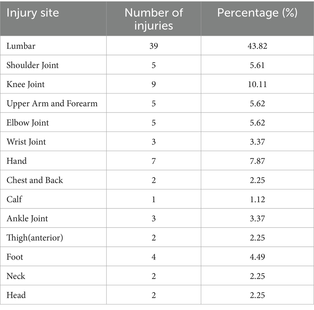 According to statistics, among the 96 members of the Datong Mine Rescue Team, 68 individuals have sustained injuries, resulting in an injury rate of 71.00%. This indicates a high risk of injury within this population, warranting focused attention. Within the injured group, a total of 89 injuries were reported, averaging 1.3 injuries per person. Analysis of injury sites reveals that the lumbar region is the most frequently injured area, with 39 cases, accounting for 43.82% of all injuries (Table 3). The knee joint is the second most common site of injury, comprising 10.11% of the total. Additionally, injuries to the elbow, shoulder, upper arm, forearm, and hand are also significant; however, the overall proportion of injuries in these areas is notably lower compared to lumbar injuries.