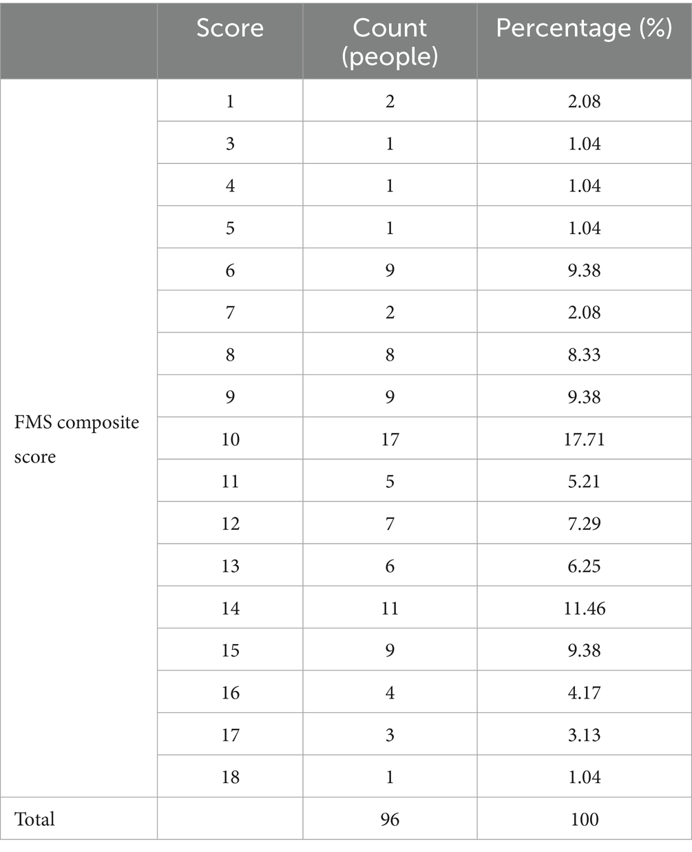 The statistical analysis of the distribution of the FMS composite scores for the Datong team (Table 4) reveals a wide range of scores. The lowest score recorded was 1, achieved by 2 individuals (2.08% of the participants), while the highest score reached 18, attained by 1 individual (1.04%). The most frequent score was 10, with a total of 17 participants (17.71%). Overall, the distribution of scores exhibits an inverted U-shaped trend, with the majority of FMS scores concentrated in the range of 8 to 15, accounting for 72 individuals (75.00%).