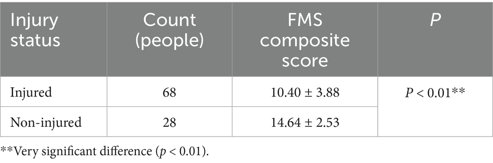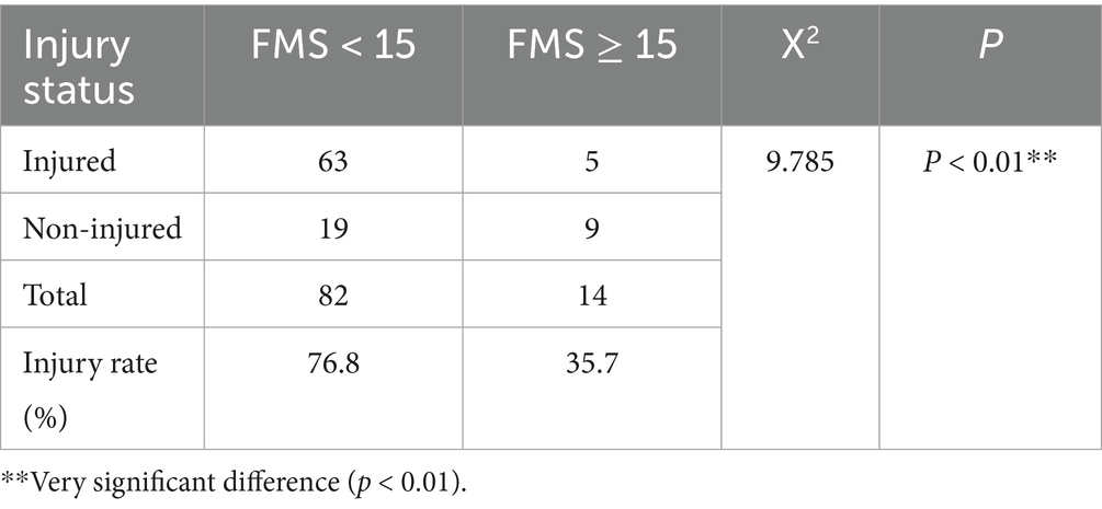 As shown in the statistical results in Table 6, there were 82 individuals in the FMS < 15 group and 14 individuals in the FMS ≥ 15 group. In the FMS < 15 group, 63 individuals sustained injuries, while 19 did not, yielding an injury rate of 76.8%. In the FMS ≥ 15 group, 5 individuals sustained injuries and 9 did not, resulting in an injury rate of 35.7%.