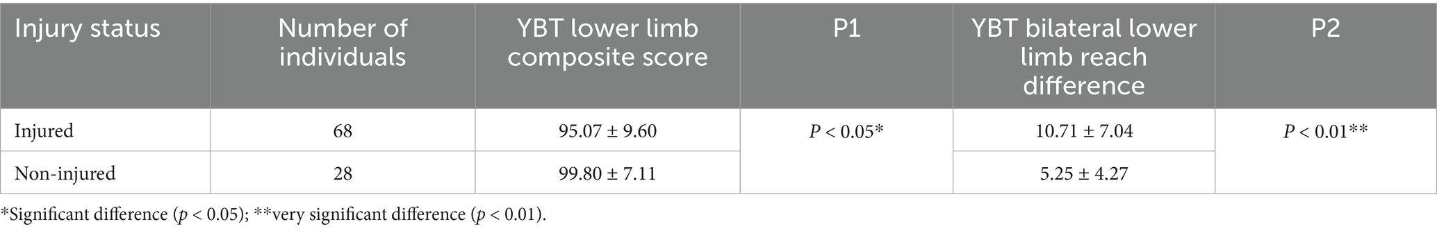 Independent sample t-tests were conducted for YBT-related data. Table 7 presents the statistical results of YBT data in relation to injury status. The results indicate a significant difference in composite YBT scores between the injured and uninjured groups (P1 < 0.05), with the injured group showing a lower composite YBT score (95.07 ± 9.60) compared to the uninjured group (99.80 ± 7.11). Furthermore, a highly significant difference was found in bilateral lower limb reach difference between the groups (P2 < 0.01), with the injured group showing a greater reach difference (10.71 ± 7.04) compared to the uninjured group (5.25 ± 4.27).