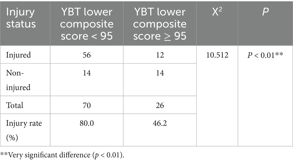 As shown in Tables 8, a total of 70 individuals were in the YBT composite score < 95 group, significantly higher than the 26 individuals in the YBT composite score ≥ 95 group. Within the YBT composite score < 95 group, there were 56 individuals with injuries, resulting in an injury rate of 80%. In contrast, the YBT composite score ≥ 95 group had 12 individuals with injuries, yielding an injury rate of 46.2%. These results indicate a obvious difference in injury rates between the two groups.