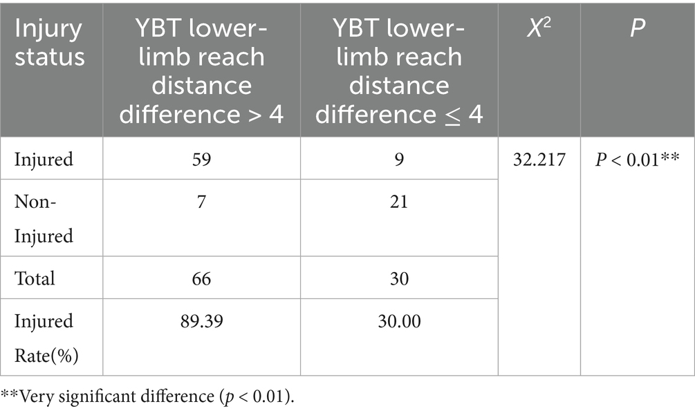As shown in Table 9, in the YBT lower-limb reach difference interval of >4, there were 66 individuals, of whom 59 experienced injuries, resulting in an injury rate of 89.39%. In the ≤4 interval, there were 30 individuals, with 9 experienced injuries, yielding an injury rate of 30.00%. The injury rates between the two intervals differ significantly. Further analysis using Chi-square testing yielded X2 = 32.217 with p < 0.01, indicating a highly significant difference in injury incidence between the two intervals.