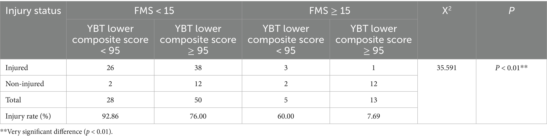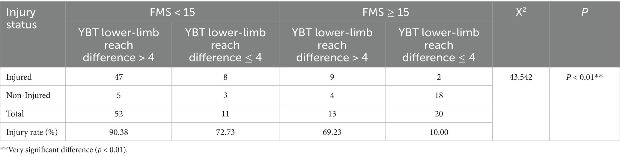 The data results from the combined analysis in this study indicate that the statistical results of the two combined scenarios (X2 = 43.542 and X2 = 35.591) are significantly higher than any of the single-factor analysis results (X2 = 32.217, X2 = 10.512, and X2 = 9.785), suggesting that combined analysis can more accurately identify potential injury risks. This conclusion is also supported by other studies. Myer et al. (49) and Eckart et al. (28) found that using a combination of FMS and YBT in athlete populations effectively identifies high-risk individuals and significantly improves prediction accuracy. In occupational injury risk prediction, Marras et al. (31) also noted that combining multiple fitness screening tools, such as FMS and YBT, helps optimize predictive models and enhances specificity. Gordon et al. (32) further supported this approach, stating that the combination of FMS and YBT not only screens for high-risk individuals but also helps reduce injury rates through corresponding functional improvement training.