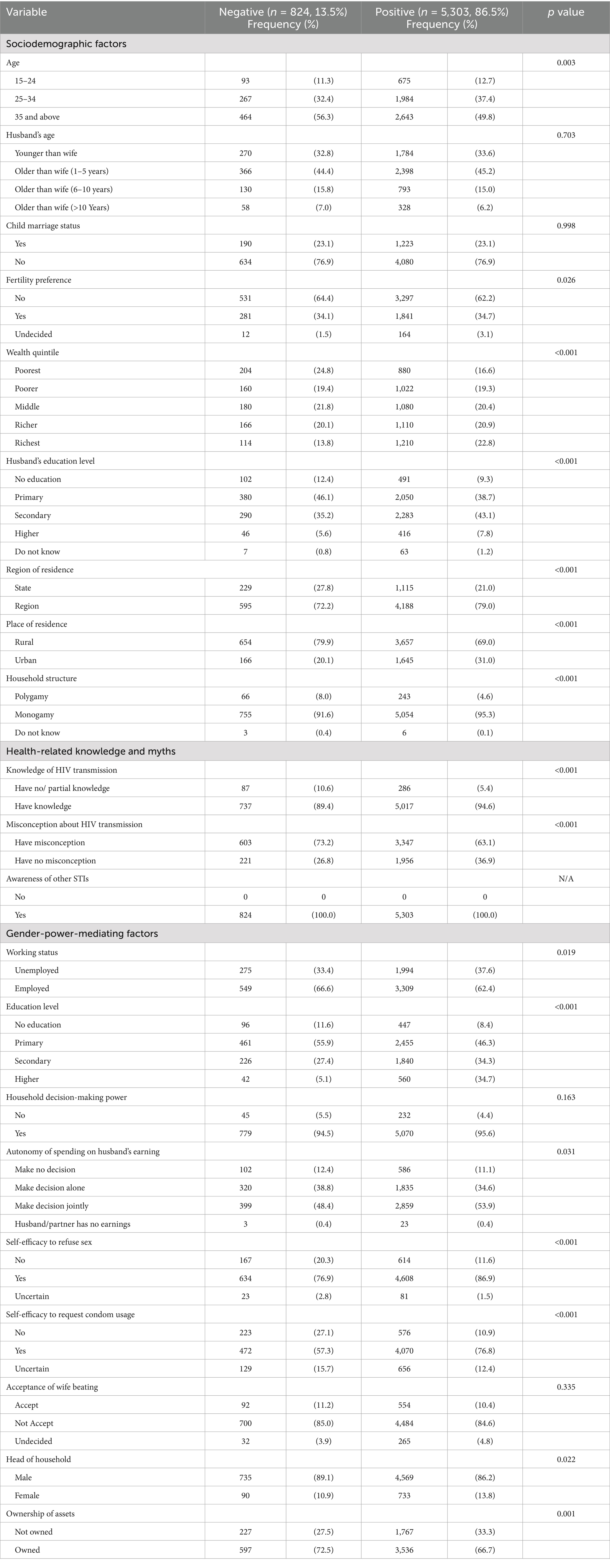 Under the category of Health-related knowledge and myths, ‘knowledge of HIV’ transmission was measured using three variables: (1) reduce risk of getting HIV: always use condoms during sex, (2) have 1 sex partner only, who has no other partners, and (3) a healthy-looking person can have HIV. While a code ‘0 = Have no/partial knowledge’ was assigned if the respondent’s answer was ‘no or do not know’ to all questions, ‘1 = Have knowledge’ was given if her response was ‘yes’ to any of the three questions (18, 31). Another variable, ‘misconception about HIV transmission’, was also computed from three variables: (1) can get HIV from mosquito bites, (2) can get HIV by sharing food with a person who has AIDS, and (3) can get HIV by witchcraft or supernatural means. It was coded as ‘0 = Have misconception’ if the answer was ‘yes or do not know’ to any of the three questions; however, if the respondent answered ‘no’ to all questions, the code ‘1 = Have no misconception’ was assigned (18, 31). The final variable, ‘awareness of other STIs’, was derived from the question “Have you heard about other sexually transmitted infections?” Responses were coded as ‘0 = no or do not know’ and ‘1 = yes.’