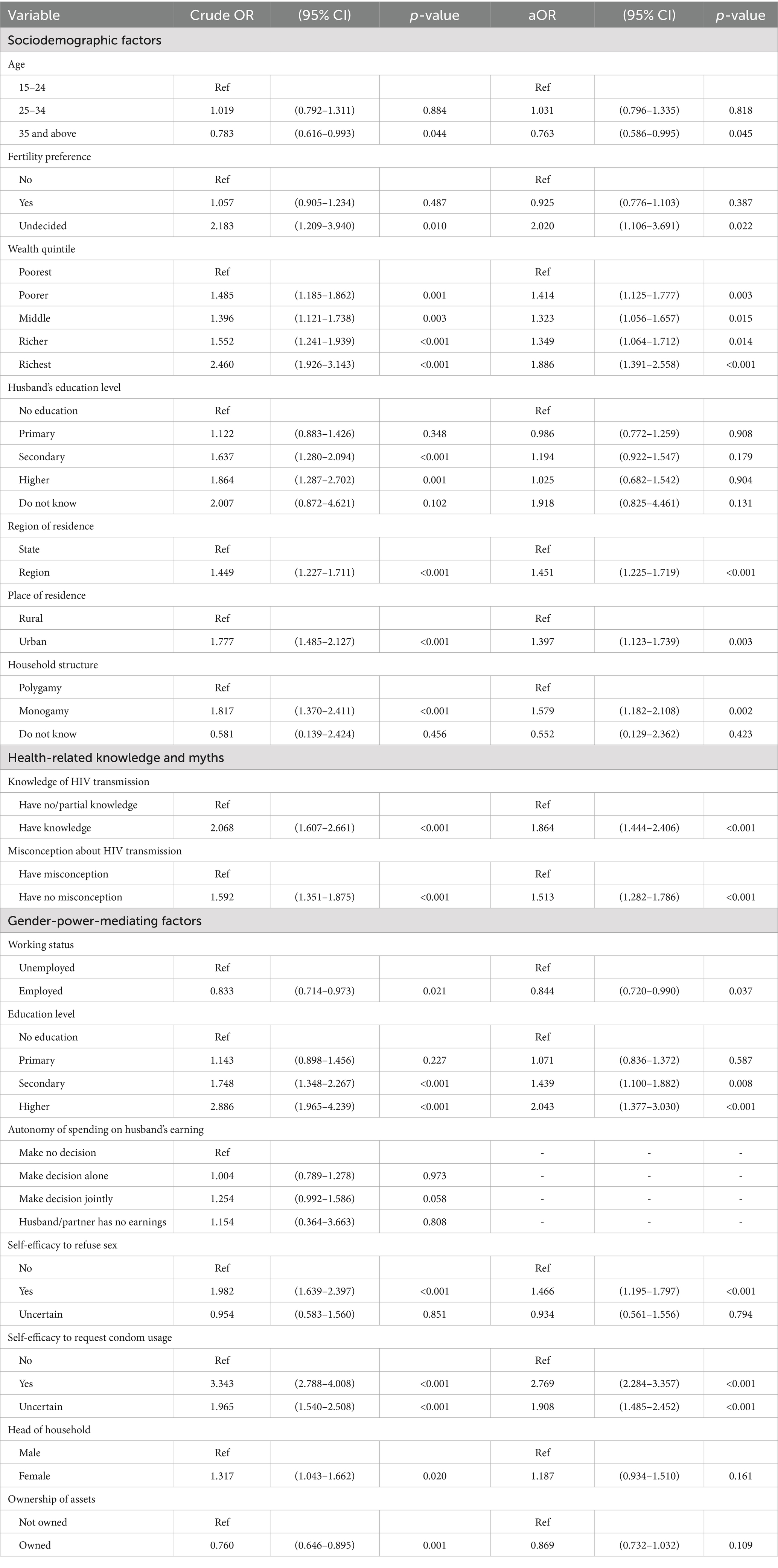 It was also found that self-efficacy was a particularly strong determinant, with women confident in refusing sex or requesting condom usage showing significantly higher odds of positive attitudes, aligning with a theoretical foundation explained in the Theory of Planned Behavior (17). This finding could explain the idea that human attitudes can influence their intention, choice, and behavior (16, 36, 37), and is also consistent with existing studies (38). Interestingly, women’s employment status showed an inverse association, similar to another Nigerian study (13), while other existing studies had found mixed results: a positive association (18), and no association (15, 18, 38). The possible explanation for this association may be the negative impact of women’s workplace exposure and the exchange of ideas regarding sexual and reproductive health (13), and may reflect the dual burden of employment and domestic responsibilities or power imbalances in relationships that working women face (39). This inverse relationship may also be due to male backlash in environments where traditional norms dominate, as employed women with more autonomy often face relational tension, reduced bargaining power at home, or stigma for stepping outside expected gender roles, and even increase vulnerability to violence (40) which may affect their sexual negotiation agency. Another study also explained that engaging in economic activities does not automatically lead to greater bargaining and negotiating power for women, as this can be influenced by the types of jobs in which women are involved (41). This highlights the importance of disaggregating employment types in future research to better understand how different forms of work influence women’s autonomy, capacity, and willingness to engage in safer sex negotiation. The finding highlights the need for targeted sexual risk prevention and reduction initiatives for working women. Beyond offering fair employment, it is also equally important to address gender power imbalances in the workplace by actively challenging discrimination and linking women to essential support services, including sexual health care, counseling, and gender-based violence resources.