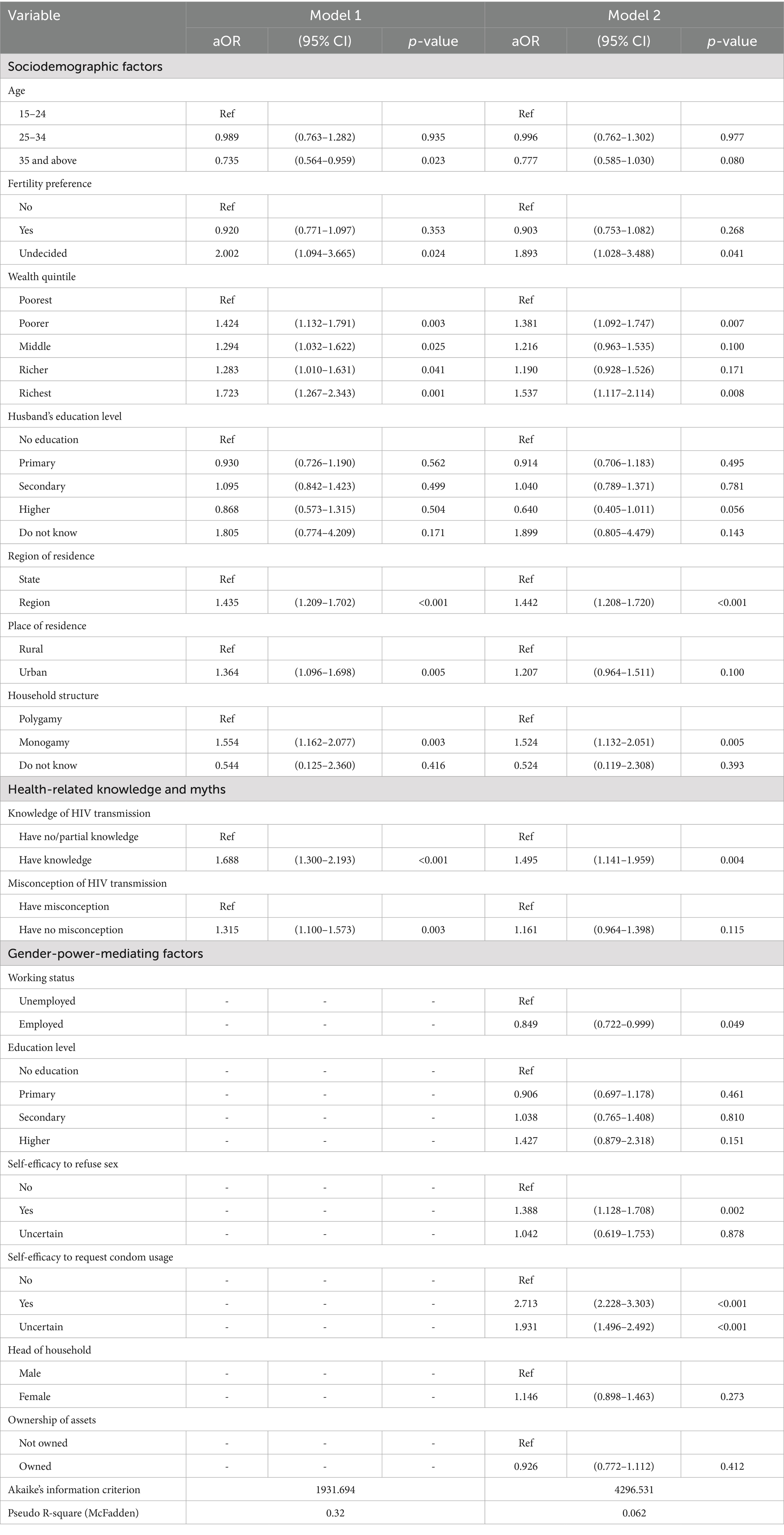 Model 1 included sociodemographic factors and health-related knowledge and myths, while Model 2 further included gender-power-mediating factors to examine the changes in associations after controlling for gender-power dynamics. Although Model 2 represented the most comprehensive model with all key predictors, its relatively low Pseudo R2 value (0.062) indicates limited explanatory capacity, suggesting that additional unmeasured factors, such as cultural and behavioral, may also play a role in shaping women’s attitudes toward negotiating SSR. See Table 3.