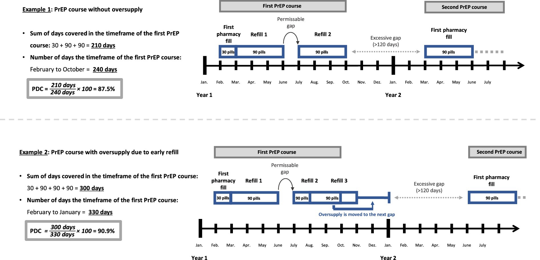What sets the PDC apart from other frequently used methods like the Medication Possession Ratio (MPR) is its consideration of the date of the (re-)fill (20, 21). For a day to be covered the prescription must have been filled on this day or in the past. It also assumes that medication use follows the prescribed DDD, which for PrEP is one pill per day (22). Any oversupply of pills due to early refills is shifted to the next gap (see Example 2; Figure 1). Consequently, the PDC cannot exceed 100% of coverage. MPR, in contrast, does not factor in the date of the refill. It sums up all pill supply within the timeframe and divides it by the number of days in the timeframe. This may lead to an overestimation of adherence due to early refills (20, 21). Example 2 reveals the difference between the two methods. As oversupply is simply summed up rather than shifted into the future, the timeframe for MPR remains constant, terminating with the last refill by November (270 days). While PDC and MPR would produce the same result in example 1, example 2 would lead to a MPR of 111.1% (300 DDD / 270 days) despite the gap of 1 month.