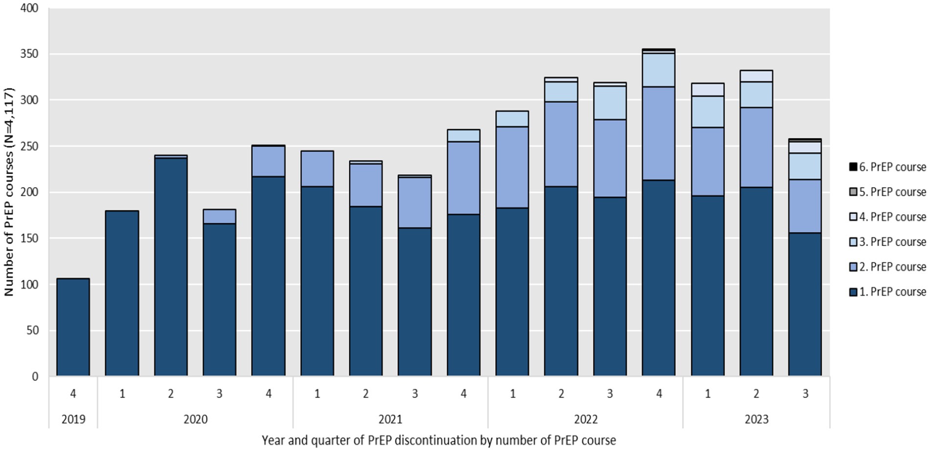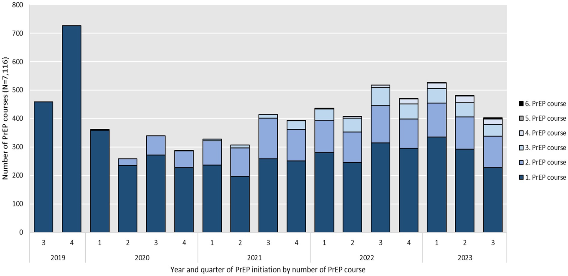 Figure 2. Year and quarter of PrEP initiation, including reinitiations by number of PrEP course between September 2019 and August 2023 (N = 7,116).