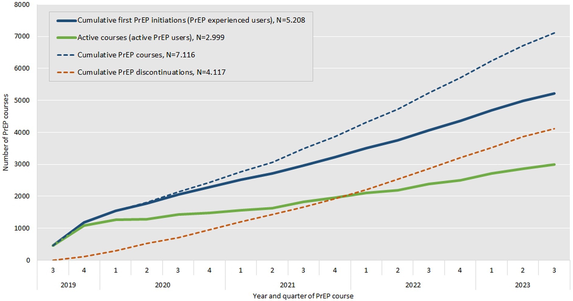 Figure 4. Number of cumulative first PrEP initiations or PrEP experienced users (bold blue line), cumulative PrEP courses ever started (doted blue line), cumulative PrEP discontinuations (doted red line) and resulting number of active PrEP users (bold green line) by year and quarter between September 2019 and August 2023.