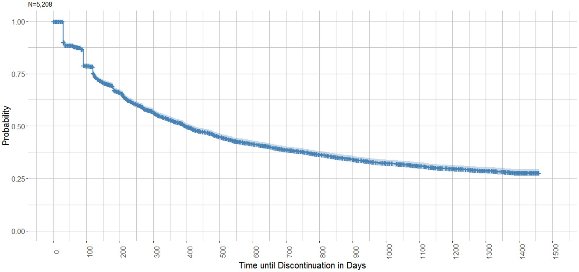 A Kaplan-Meyer survival analysis was conducted to visualize the time until discontinuation of the first PrEP course.