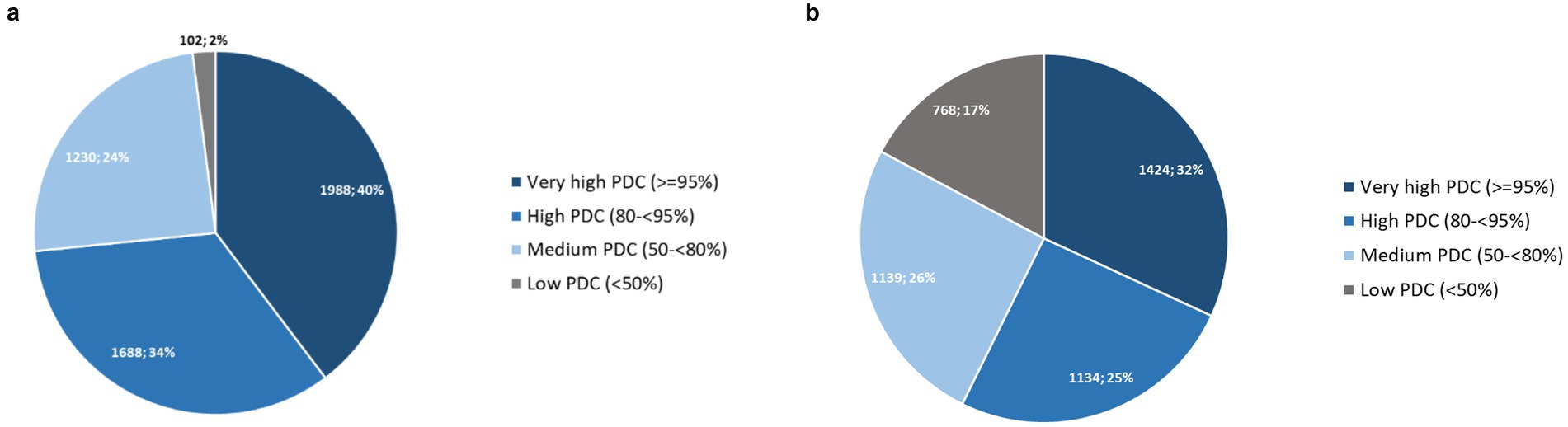 Figure 6. (a) PDC of all PrEP courses with at least two pharmacy fills (N = 5,011); (b) PDC of individuals with at least two pharmacy fills from first initiation until last discontinuation (N = 4,465).