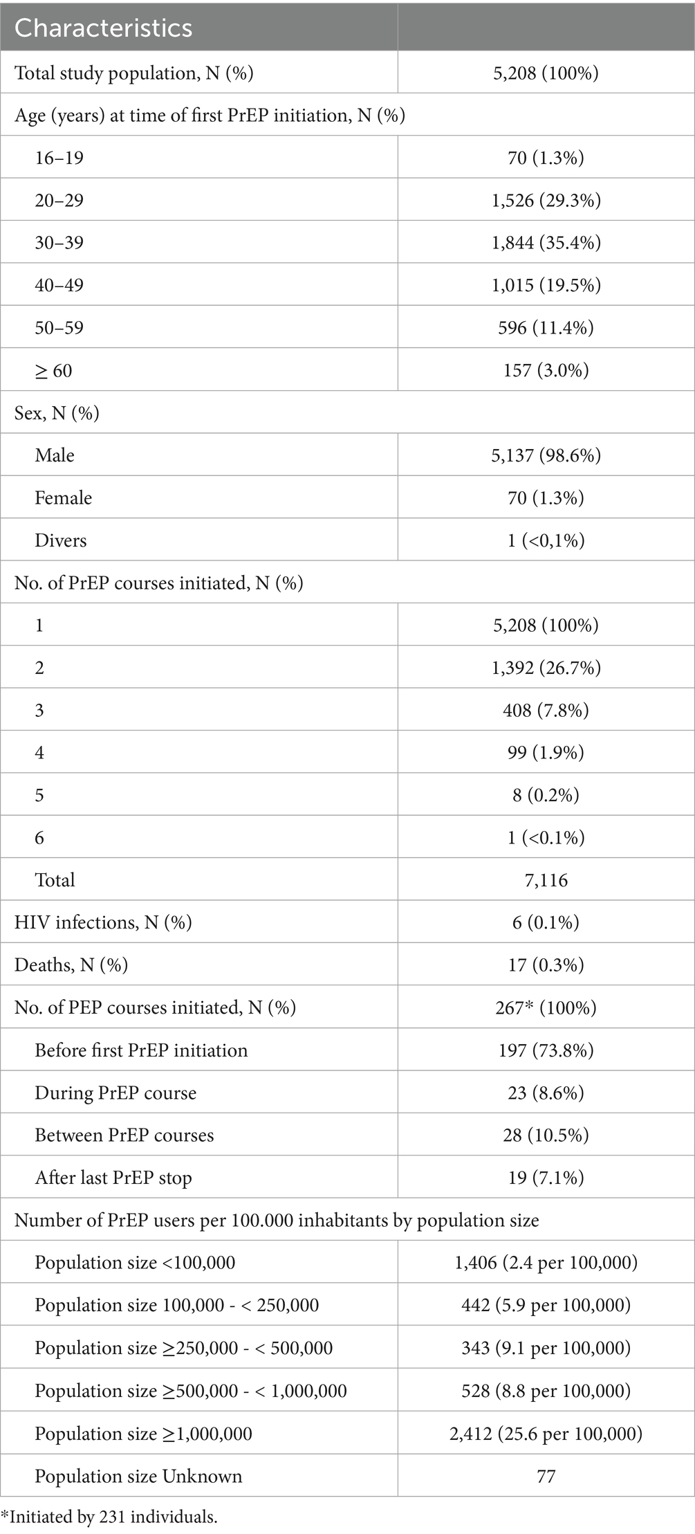 Based on the study’s inclusion and exclusion criteria we identified 5,208 individuals who initiated PrEP between September 1, 2019 and August 31, 2023. The total observation time was 8,822 person-years (py) with a median and average PrEP observation time of 1.3 py (IQR 0.5–2.9 py; range 0–4 py) and 1.7 py (SD 1.3 py, range 0–4 py), respectively. A total of 17 (0.3%) deaths occurred.