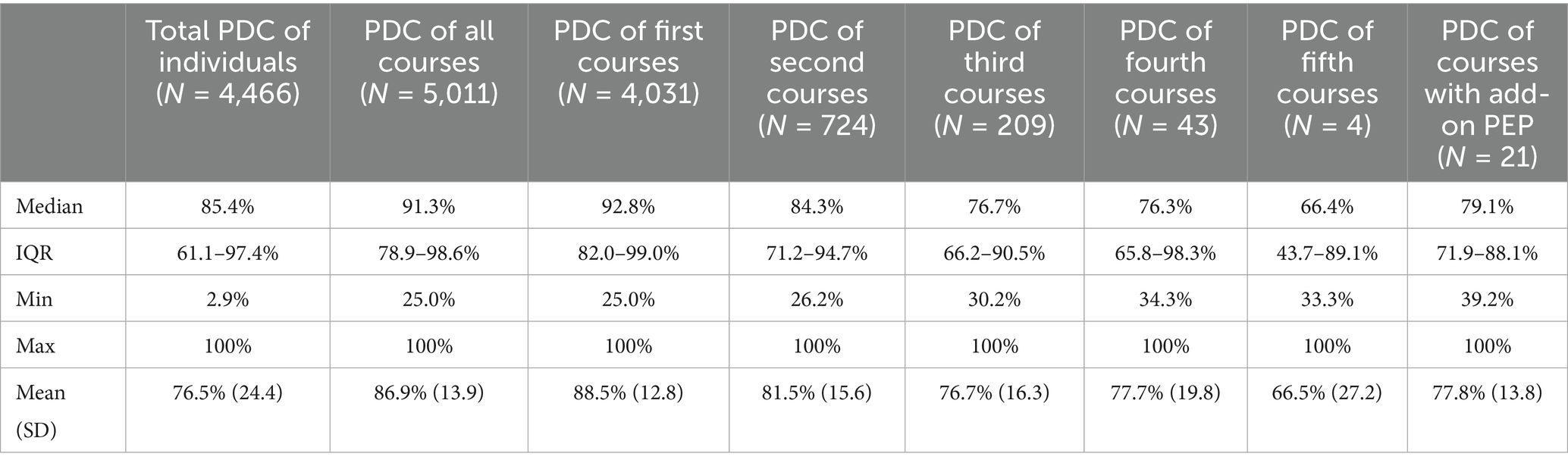 The median PDC of all observed courses was 91.3% (IQR 78.9–98.6%). While the median coverage of the first PrEP course was highest, it decreased for the second and subsequent courses (see Table 2).