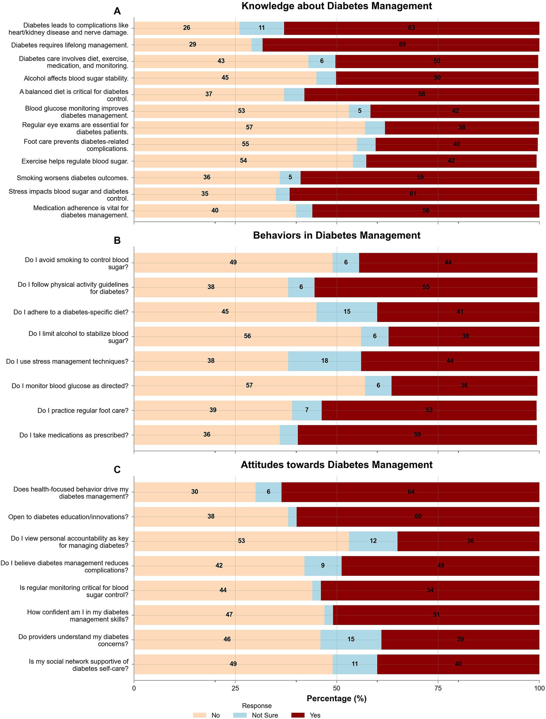 Figure 1. Knowledge, behaviors, and attitudes related to gestational diabetes management. (A) Knowledge assessment on diabetes complications, management strategies, and risk factors. (B) Self-care behaviors include smoking cessation, diet, exercise, medication adherence, and glucose monitoring. (C) Attitudes towards diabetes management, including health-focused behaviors, education openness, personal accountability, and confidence in self-care.