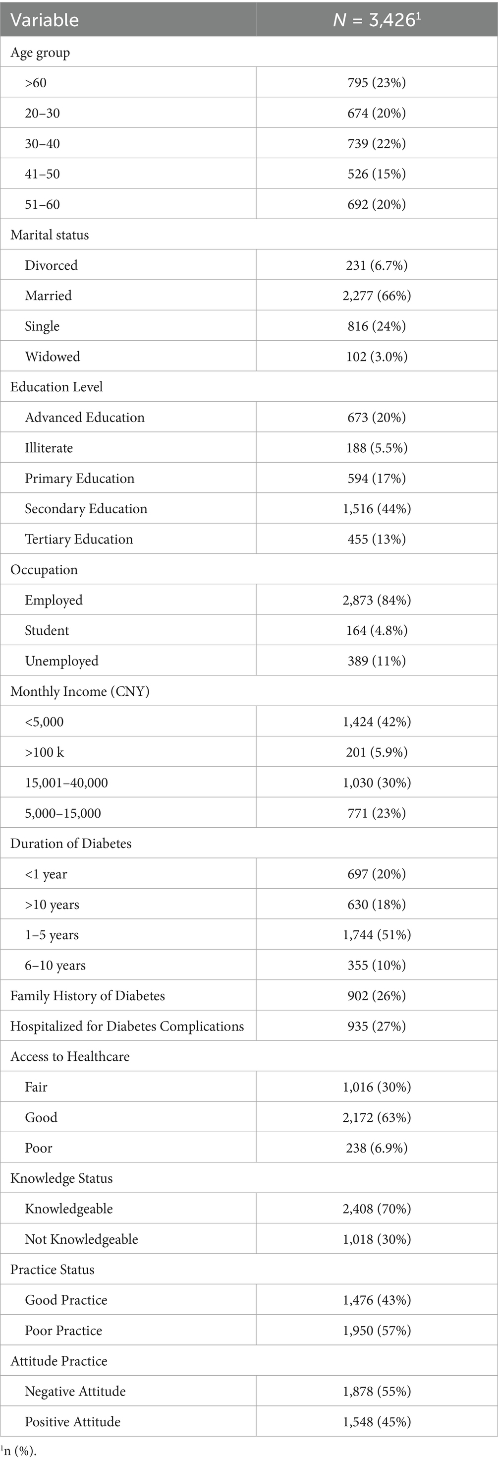 In this cross-sectional study, we evaluated the KAP related to GDM among 3,426 Chinese women. Demographic and clinical characteristics (Table 1) showed a balanced age distribution, with 42% aged 20–40 years (20–30 years: 20%; 30–40 years: 22%), 23% over 60 years, and 15% aged 41–50 years. Most participants were married (66%) and employed (84%). Education levels varied, with 44% having secondary education, 20% advanced education, and 5.5% being illiterate. Socioeconomically, 42% reported a monthly income below 5,000 CNY, while 30% earned 15,001–40,000 CNY. GDM duration was 1–5 years for 51, and 26% reported a family history of diabetes. Notably, 27% were hospitalized for diabetes complications, and 63% rated their access to healthcare as good. Overall, 70% were knowledgeable about GDM, 45% displayed a positive attitude, and 43% demonstrated good practices.