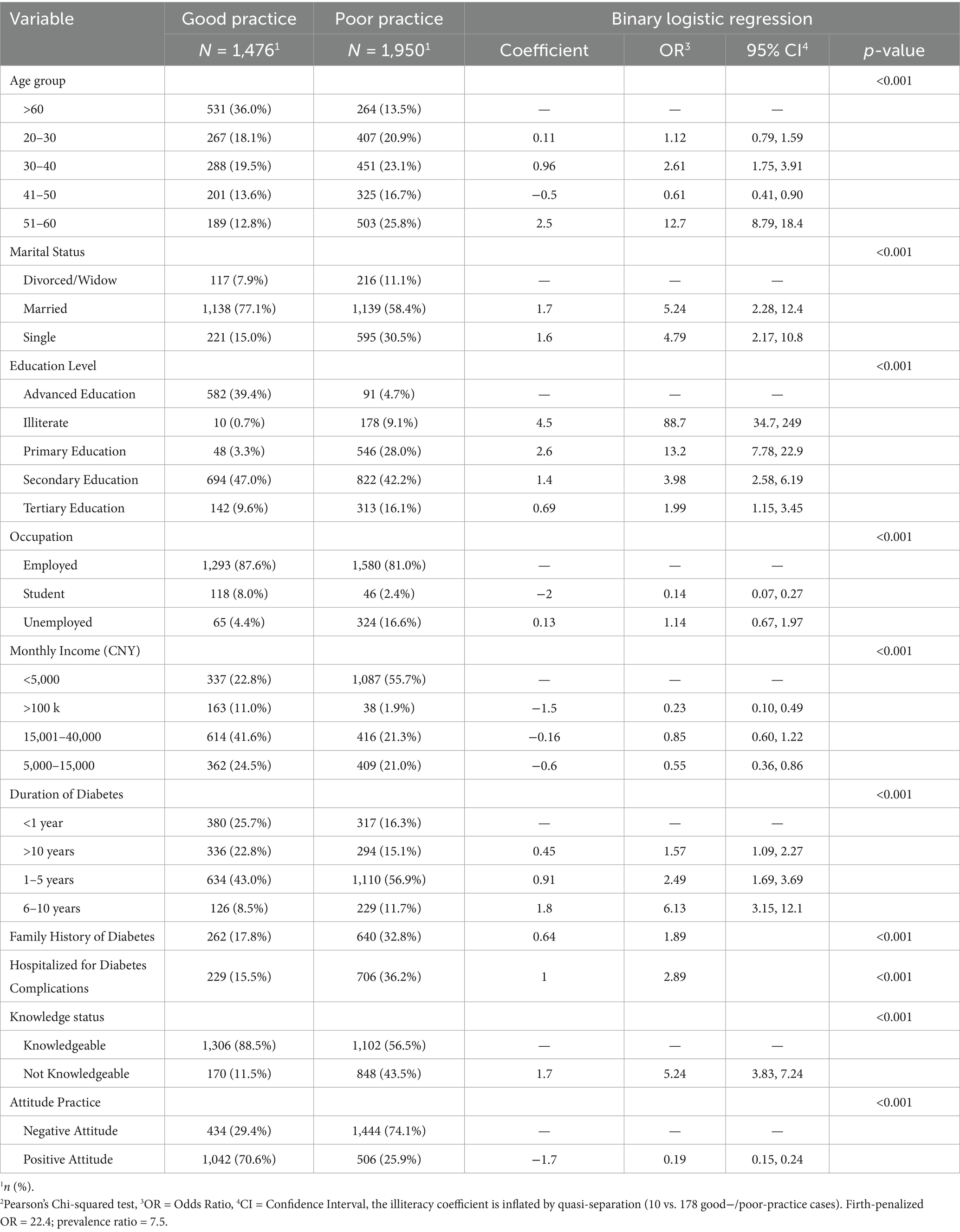 Table 6. Logistic regression analysis of factors influencing practice status, highlighting determinants of good and poor self-care behaviors.