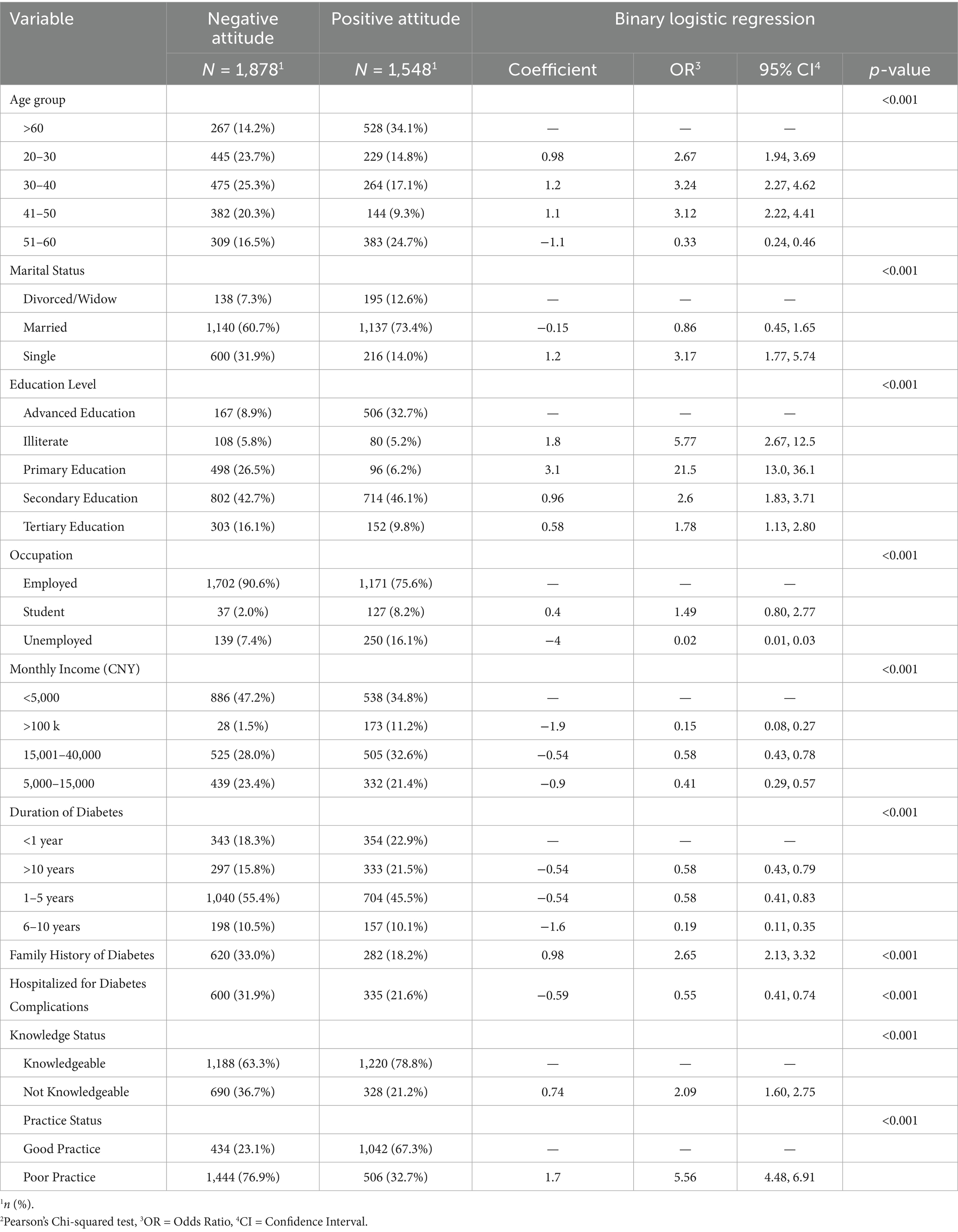 For attitudes (Table 7), younger women (20–30 years: OR 2.67, 95% CI 1.94–3.69, p < 0.001) and those with primary education (OR 21.5, 95% CI 13.0–36.1, p < 0.001) were more likely to have a positive attitude. Conversely, poor practices significantly increased the odds of a negative attitude (OR 5.56, 95% CI 4.48–6.91, p < 0.001). A family history of diabetes was associated with a positive attitude (OR 2.65, 95% CI 2.13–3.32, p < 0.001), while prior hospitalization predicted a negative attitude (OR 0.55, 95% CI 0.41–0.74, p < 0.001).
