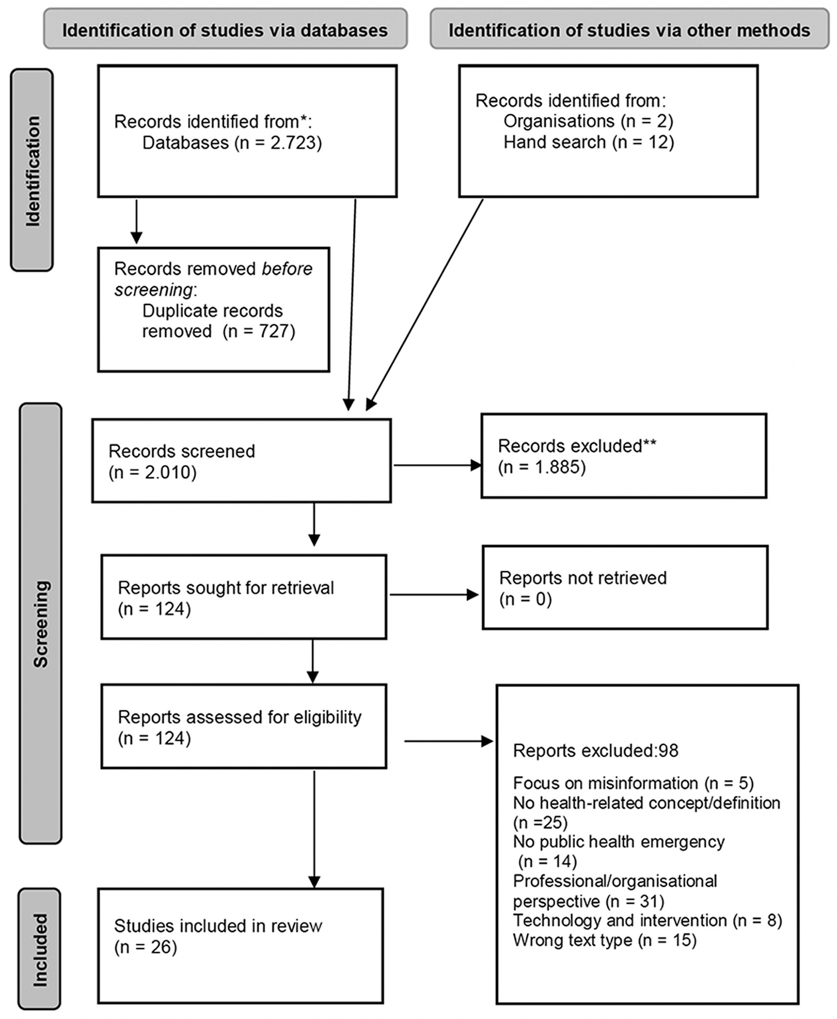 The literature search identified 2,723 publications out of which 727 were duplicates. Two independent reviewers (JB, AP) screened the titles and abstracts of the remaining 1,996 publications. 1,885 publications were excluded because they often referred to disasters with no apparent health implications or were devoted to the dissemination of information between disaster control organizations. 124 publications were subjected to a full-text review. Further publications were then sorted out, partly because they did not contain a health-related or health literacy-related concept or definition, did not deal with public health emergencies, contained only organizational perspectives or expert opinions, or focused on misinformation or the more technical aspects of disasters. Conflicts between the two reviewers were resolved by consulting a third reviewer (MK). Two researchers (JB, AP) analyzed the 26 publications finally included, extracted the data relevant to the research question and created a narrative summary. The entire procedure is documented in a PRISMA flow diagram (32) in Figure 1.