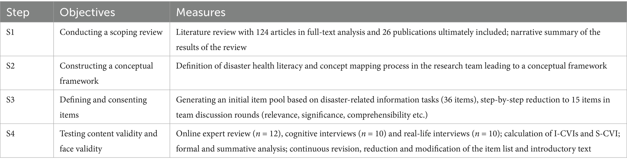 We set up an interdisciplinary and interinstitutional working group, consisting of German members of the WHO Action Network on Measuring Population and Organizational Health Literacy (M-POHL) on the one hand, and public health and disaster nursing experts, on the other. This working group was co-chaired by the first and last author. For our research, we decided to apply a standard methodological approach for the development of instruments for social science survey research (30). The first part of the instrument development process took 9 month (April to November 2024) and consisted of four steps (S1-S4), which are documented in Table 1 and explained in detail below. The second part of the development process, the subsequent piloting of the new instrument and the application of exploratory and confirmatory factor analyses will be documented in a separate publication.