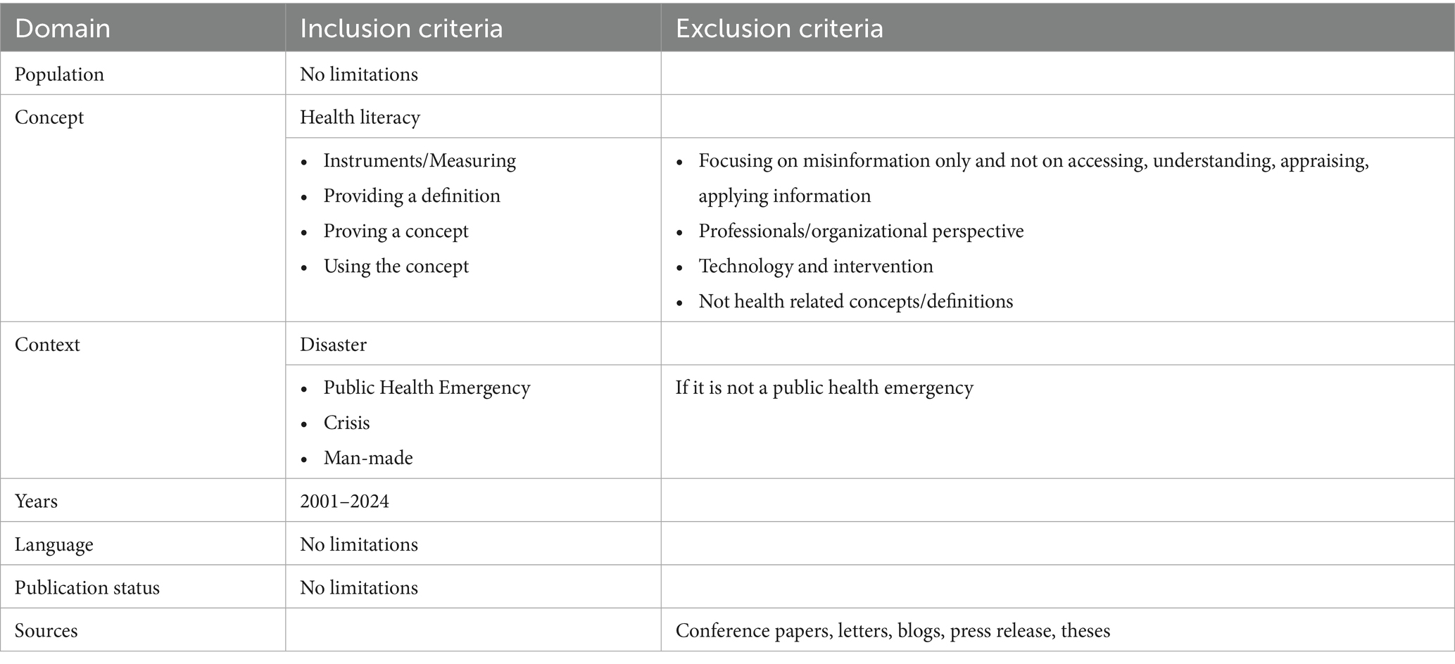 We searched the databases MEDLINE, CINAHL, PsycINFO and SocINDEX and DACH-Information via EBSCOhost, as well as the Cochrane Library-Database from April to May 2024. This search was extended by a hand search in the lists of references of texts already found in key journals, and on websites of relevant disaster risk reduction organizations. As search terms we used “disaster risk reduction,” “disaster literacy,” “health literacy” describing the concept of health literacy combined with search terms describing the context of disasters like “emergenc*,” “cris*,” “disaster*,” “public health emergency.” Since the topic of disasters has received significantly more attention since the terror attacks of 11 September 2001, we included literature published between 2001 and the time of the search. There were no restrictions on language, publication status or quality. The inclusion and exclusion criteria were based on the PCC scheme (Population, Concept, Context) with a focus on publications dealing with conceptual or measurement issues in context of literacy, health and (public health) emergencies, crisis or disasters of any kind. Studies that use the concept of health literacy (1) in general, (2) as part of a definition, (3) for an instrument or (4) develop a concept themselves were included. If the focus was exclusively on (intentional) misinformation, if only organizational perspectives or only technical aspects of disasters were discussed, if an intervention or technology was described or if no health aspects were considered, the publications were excluded. Conference papers, letters, blogs, press releases and theses were disregarded (see Table 2 for inclusion and exclusion criteria).