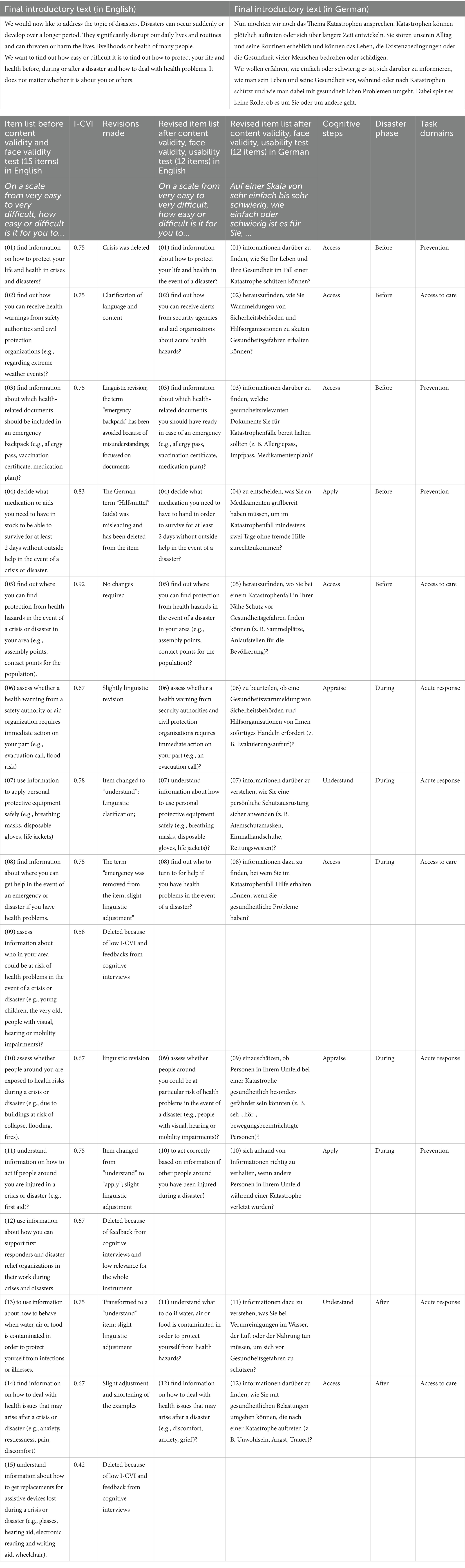 Results: Based on suggestions from the literature, we defined DIS-HL and identified key components of the construct. In item development, we considered four cognitive dimensions (access, understand, appraise, apply), the heterogeneous information requirements before, during and after events, and three information task domains (prevention, acute response, access to care). Based on the experts’ feedback and the results of the face validity assessment we reduced the original 15 items to 12 items. Furthermore, we made moderate adjustments to the content and language of the items and shortened the introductory text to improve clarity and comprehensibility.