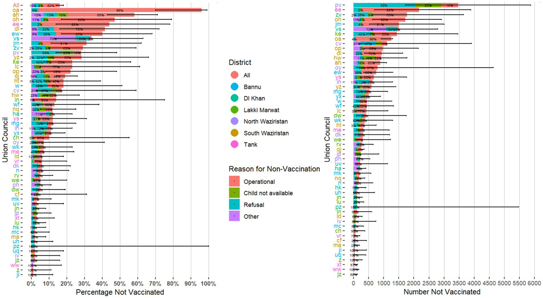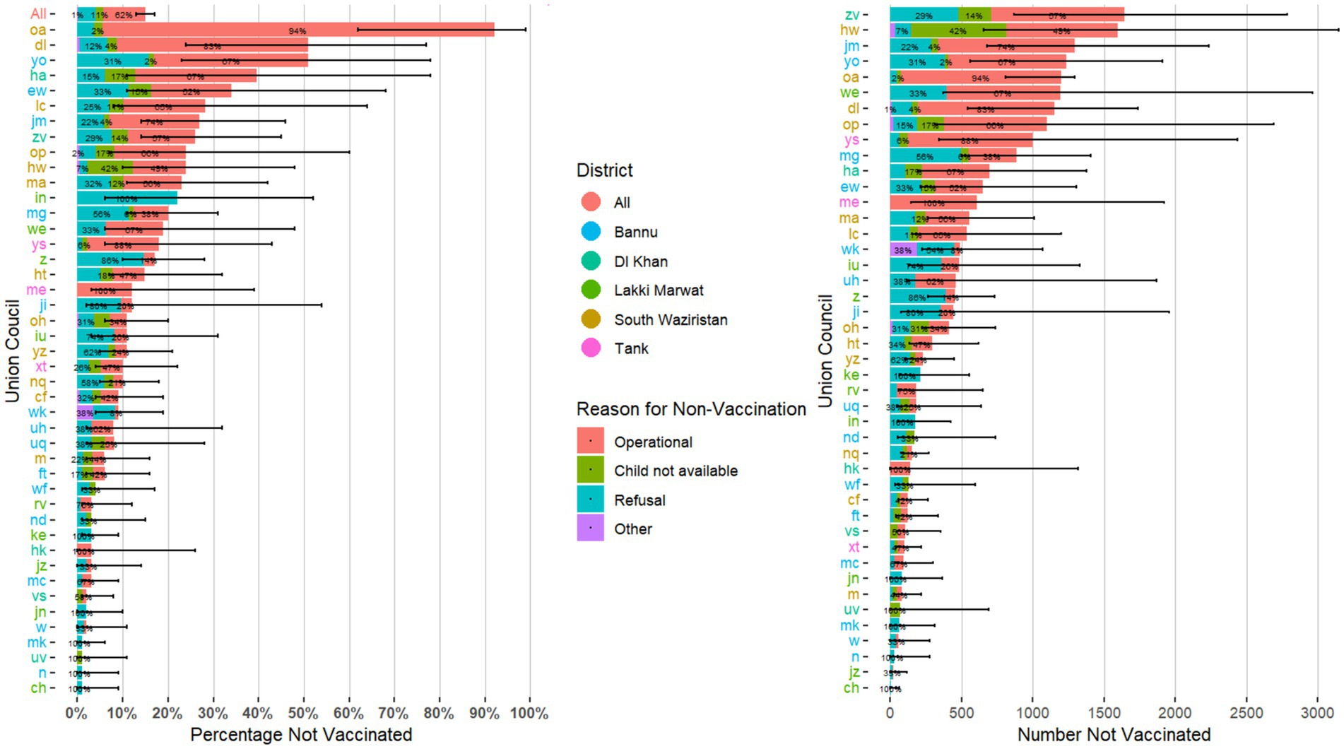 Figure 2. Estimated percentage and number of children who missed receipt of bOPV with 95% confidence intervals, by Union Council with stated reasons for non-vaccination (N = 44*)—Round 2 of Special “Reaching the Unreached” (RUR) Multi-Antigen, Fixed-Post Campaign, South Khyber Pakhtunkhwa, Pakistan, August 2023. *Union councils with only one village selected (n = 1) or with 0% missed children (n = 2) were not included in this figure. bOPV, bivalent oral poliovirus vaccine. Union councils’ names were anonymized for the purpose of this publication.