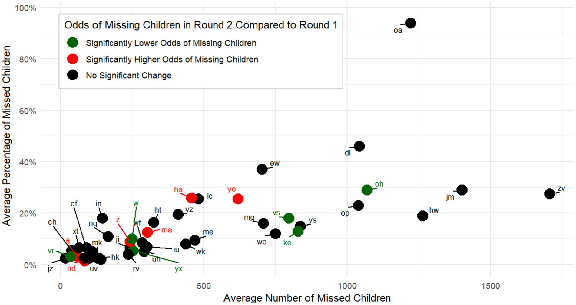 Among the 45 UCs that had a PCE conducted after both RUR1 and RUR2, 2 UCs had an average percentage of missed children >40% and an average number of missed children >1,000 (Figure 3). Six UCs had a statistically significant improvement in term of the odds of missing children between the two rounds, and 6 UCs had a statistically significant decline (Figure 3).