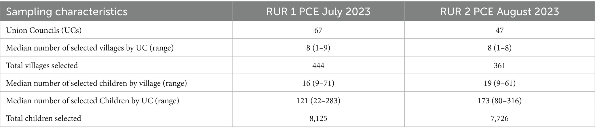 In this context, the Pakistan Polio program in collaboration with Federal Directorate of Immunization devised a “special” immunization campaign called “reaching the unreached” (RUR) in May 2023 to be led by the provincial Extended Program on Immunization (EPI) of KP. The goal was to reach all children <5 years of age within 69 union councils (UCs) that were designated by the KP Emergency Operations Center (EOC) as “super high-risk,” through three rounds of immunization campaigns, providing bivalent oral poliovirus vaccine (bOPV) and other EPI vaccines. This initiative was also endorsed by the GPEI’s Technical Advisory Group on Poliomyelitis Eradication in Afghanistan and Pakistan in its meeting in June 2023 (6).