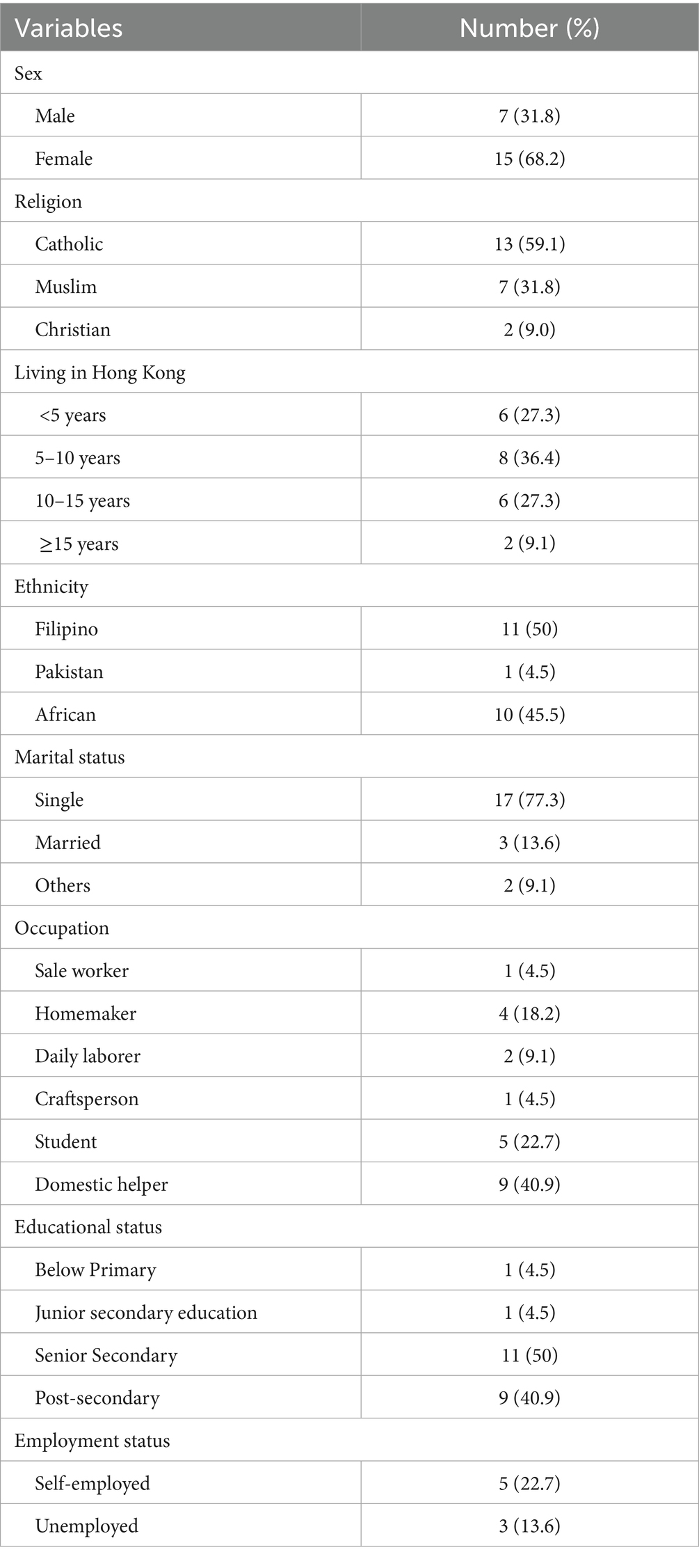 A total of 31 participants were invited for interviews, and 22 agreed to participate, with a response rate of 88%. The average age of participants was 24.7 (SD = 4.0) years, ranging from 17 to 30 years. As illustrated in Table 1, most of the participants were females (68.2%), catholic (59.1%), Filipino (50%), living alone (40.9%), single in marital status (77.3%), and domestic helpers (40.9%).