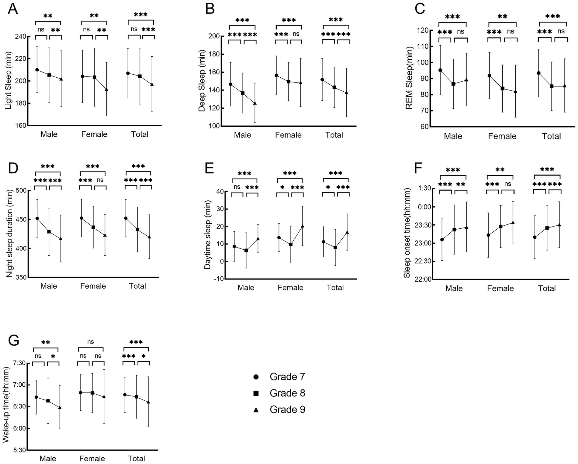 Figure 1. Changes in sleep characteristics of different genders in 3 years of middle school: (A) light sleep duration, (B) deep sleep duration, (C) REM duration, (D) night sleep duration, (E) daytime sleep duration, (F) sleep onset time, (G) wake-up time. *p < 0.05, **p < 0.01, ***p < 0.001.