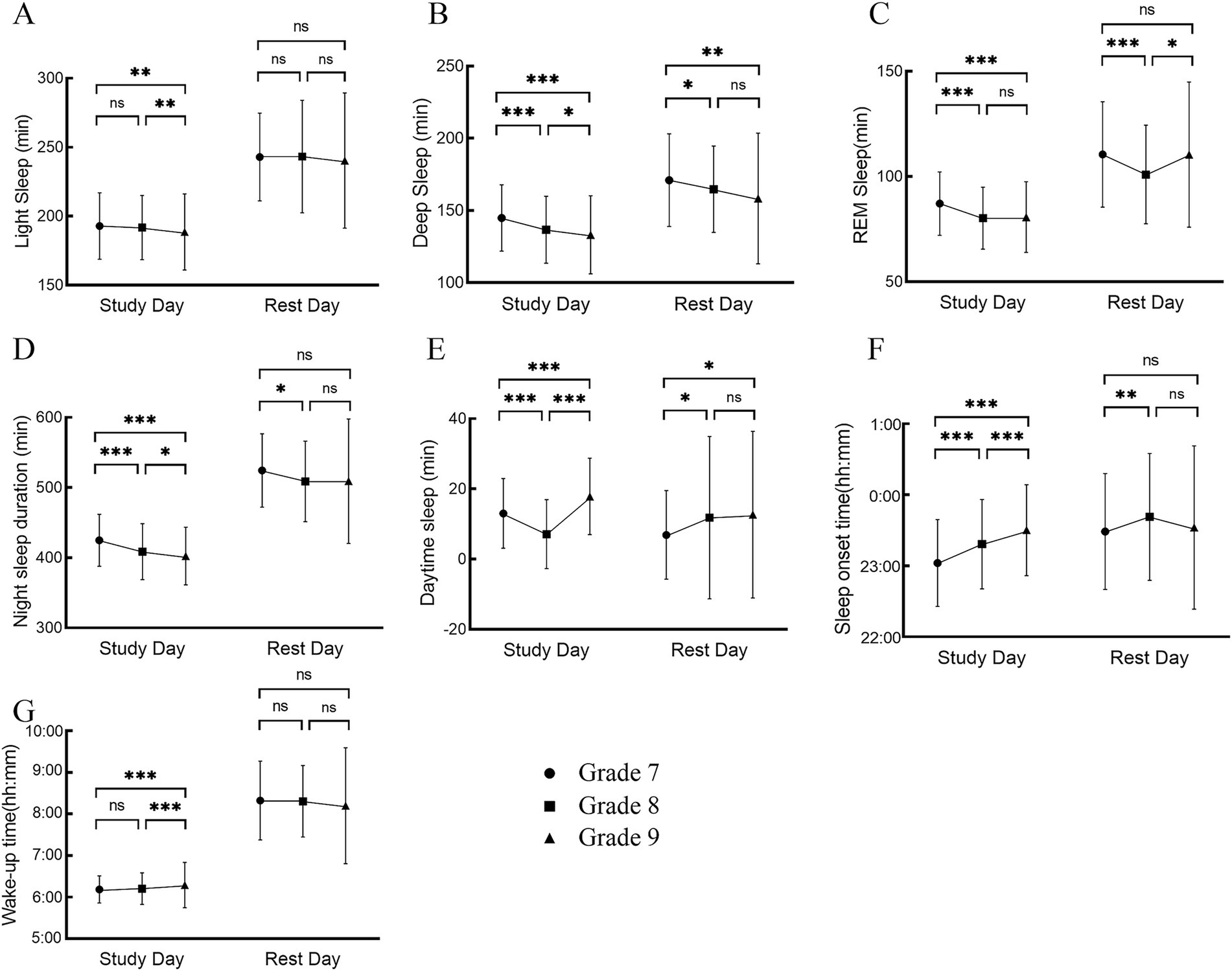 Figure 2. Changes in sleep characteristics of different time types in 3 years of middle school: (A) light sleep duration, (B) deep sleep duration, (C) REM duration, (D) night sleep duration, (E) daytime sleep duration, (F) sleep onset time, (G) wake-up time, *p < 0.05, **p < 0.01, ***p < 0.001.