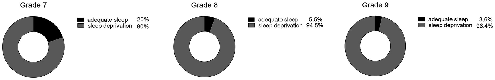 That study examined the sleep patterns of middle school students over 3 years (seventh, eighth, and ninth grades) after implementation of the policy. Findings indicate that students’ nighttime sleep duration decreased progressively with grade level, dropping from 452.3 ± 32.4 min in G7 to 420.4 ± 37.9 min in G9. Furthermore, students’ average sleep duration remained persistently below the recommended 8-h health standard (25). As students advance through the grades, the persistent decline in sleep duration is a cause for concern. The American Academy of Sleep Medicine recommends that adolescents aged 13 to 18 should regularly sleep 8 to 10 h to promote health (25). Therefore, this study classified adolescents who slept less than 8 h on average as sleep deprived. This study has shown that the prevalence of sleep deprivation among adolescents has increased over the years. This finding consistents with the results of a systematic review, which examined sleep duration among children and adolescents in 20 countries from 1905 to 2008 (26). It found that adolescents’ hours of sleep declined rapidly from year to year during this period, and the risk of developing sleep deprivation increased. Additionally, the night sleep duration of adolescents in this study was significantly lower than that of their peers in the United States (18), Malaysia (27), Australia (28), and Canada (29). The reported rate of sleep deprivation among students in each of the 3 years of middle school exceeded 80%, which was much higher than the national average (30). This means that Chinese middle school students still suffer from sleep deprivation.