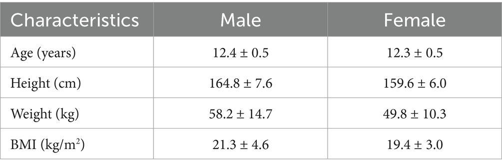 Sample size calculation was performed a priori using G*Power software (version 3.1). The calculation was based on the primary outcome of the study, which was the night sleep duration. We used a two-tailed independent-samples t-test to compare the mean sleep duration between genders (male vs. female). The effect size was set to 0.15, representing a small effect based on pilot data and previous literature reporting small effect sizes in adolescent sleep research. The α error probability was set at 0.05, and the desired power (1-β) was 0.8 (19). The analysis indicated that a total sample size of 68 participants (34 per group) was required to detect such an effect. Considering a lost-to-follow-up rate of 20–30%, the final sample size selected for the study was 110 participants. In December 2021, we recruited 110 students from four grade7 at a secondary school in Nanjing, China, using a random cluster sampling method. Inclusion criteria: good physical health, no contraindications to exercise, and no psychiatric disorders. The experiment study ended in December 2023. During the three-year follow-up study, some participants withdrew from the experiment for reasons such as transferring schools, discomfort with wearing devices, and academic pressure. After analyzing the three-year data, the final group included 82 students: 40 boys and 42 girls. The dropout rate was 25.45%. The study was introduced to the school, teachers, and parents, and their consent was obtained. Parents signed an informed consent form. All participants were informed about the experimental plan, procedures, and related testing requirements. The study was approved by the Human Research Ethics Review Committee of the Nanjing Sports Institute (No. RT-2021-02), under the Declaration of Helsinki. The information of participants is presented in Table 1.