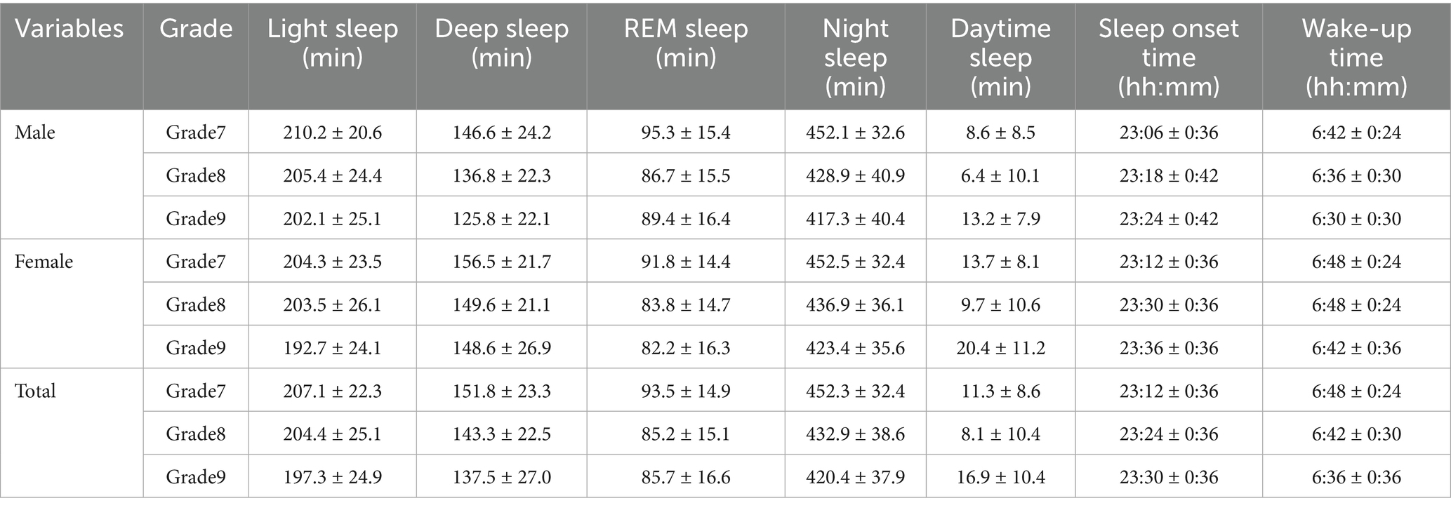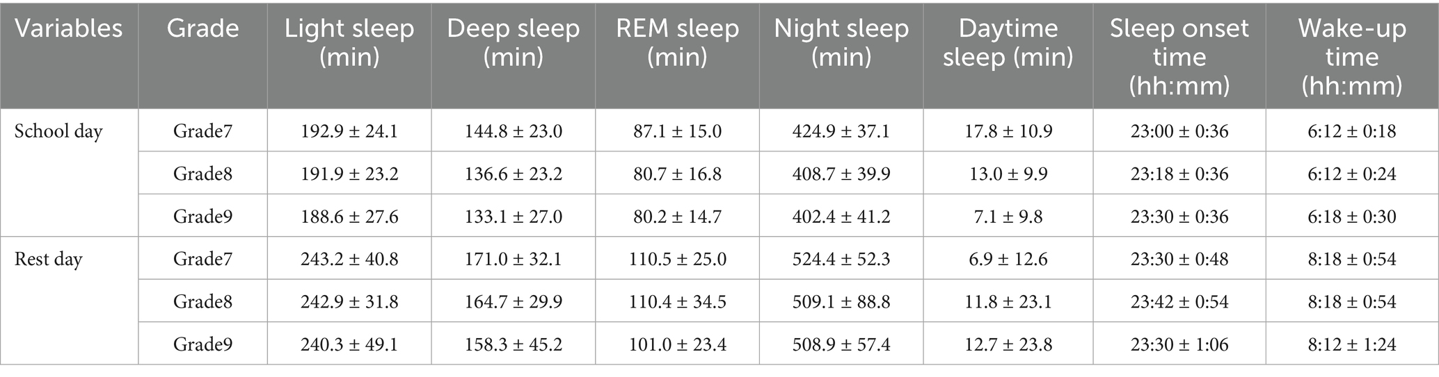 Results: For 82 middle school students, their sleep onset time gradually delayed over the years, leading to a yearly decrease in night sleep duration (Grade 7: 452.3 ± 32.4 min; Grade 8: 432.9 ± 38.6 min; Grade 9: 420.4 ± 37.9 min, F = 50.30, p<0.001). The incidence of sleep deprivation gradually increased (x2 = 17.09, p = 0.0002). Over the 3 years, there were no statistically significant differences in wake-up time, sleep onset time, or night sleep duration between genders, and there was no interaction with time and gender. Sleep duration on rest days was significantly longer than on school days (p < 0.001). There was a significant interaction between time and time type (rest day/school day) on daytime sleep duration, wake-up time, and sleep onset time (p < 0.05).