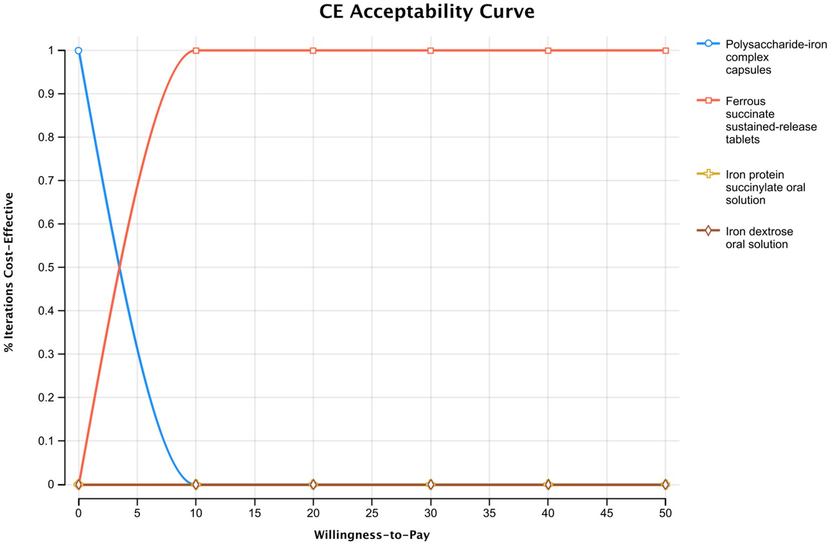 The results of the probabilistic sensitivity analysis are presented in the cost-effectiveness acceptability curve in Figure 4. The curve shows that for any WTP value above the calculated ICER of $3.23 per 1% increase in total effective rate, ferrous succinate sustained-release tablets have the highest probability of being the most cost-effective option. The analysis demonstrates a rapid increase in this probability, reaching nearly 100% at a WTP of approximately $10. This indicates that the economic advantage of ferrous succinate sustained-release tablets is robust and confirmed at a very low WTP threshold, and it remains the definitive optimal choice across all higher values, including the contextual reference point of $5,523. These probabilistic results strongly support the base-case findings under parameter uncertainty.
