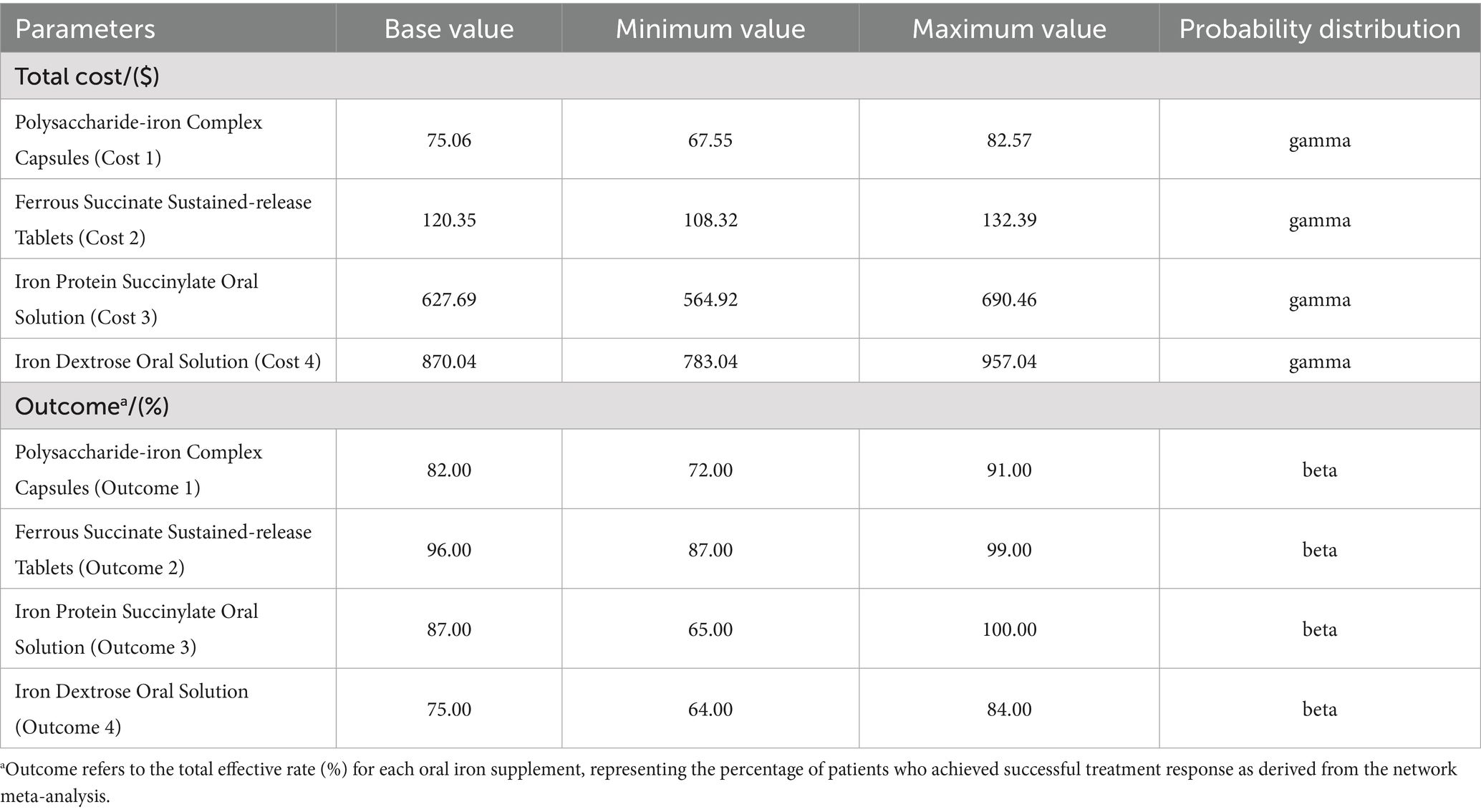 Existing economic evaluations mainly compare oral and intravenous iron treatments, with few studies focusing on the different types of oral iron preparations. No definitive conclusions have been reached regarding their economic advantages (29–31). Given the limited medical resources and rising healthcare costs, it is essential to base clinical practices on economic value. Assessing the clinical efficacy and economic value of IDA therapies during pregnancy is crucial for selecting the most appropriate treatment options. In China’s oral iron market, the leading products are polysaccharide iron complex and iron protein succinylate oral solution, while ferrous succinate sustained-release tablets and iron dextran oral solution have smaller market shares (32). Currently, there are no studies comparing their economic feasibility.