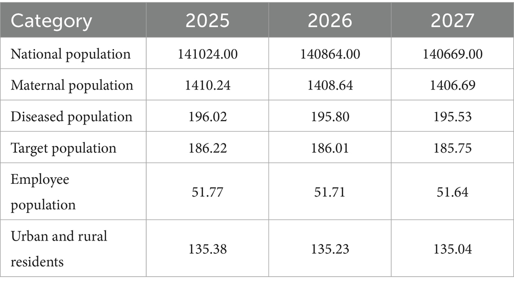 We used the 2020 population size of China as a baseline and combined it with data from the National Statistical Bulletin on the Development of Basic Medical Security. This data shows that the medical insurance participation coverage remains stable at over 95%. Therefore, we assumed a participation rate of 95% for this analysis (Table 2).