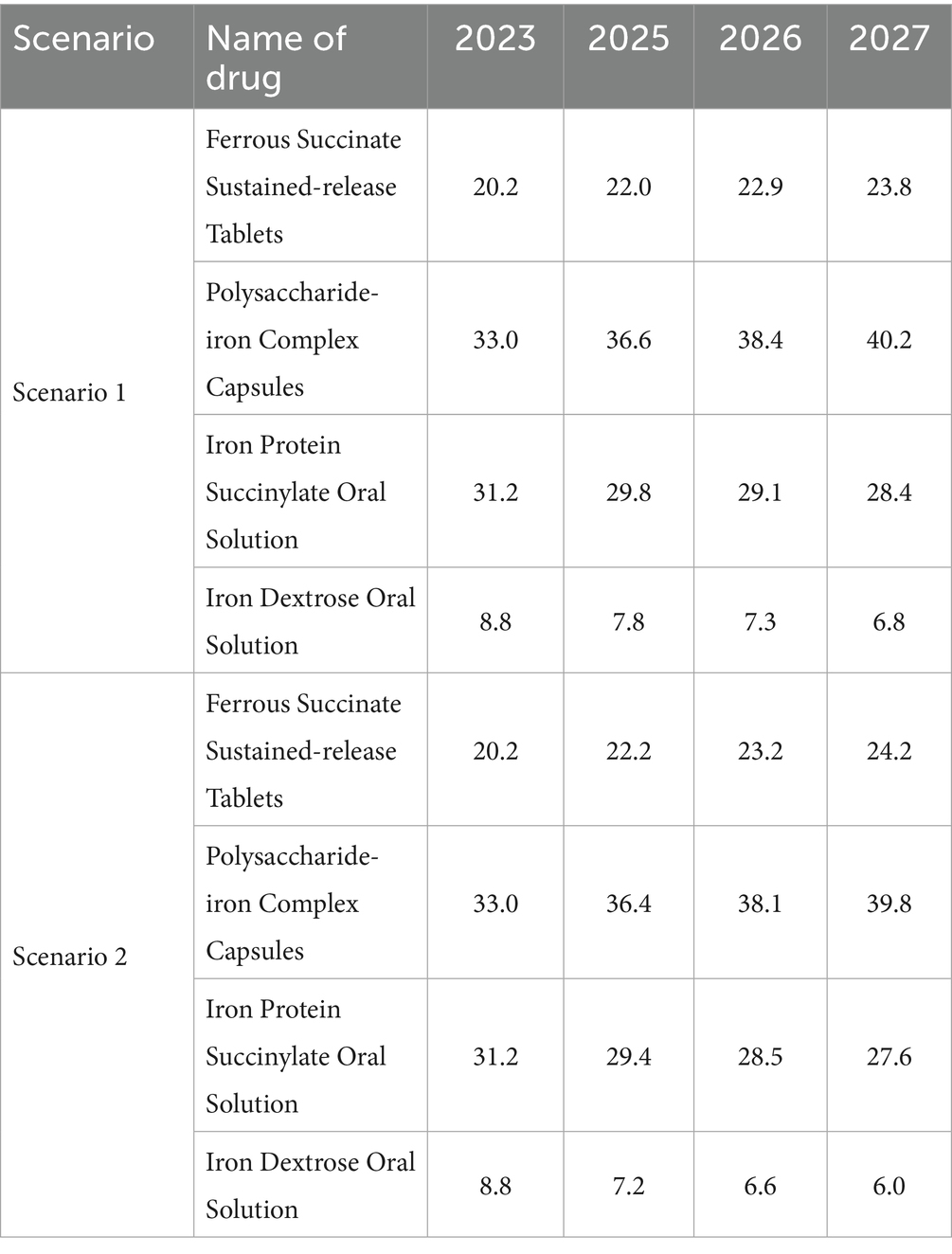 The market share projection is mainly based on the sales data of 2023 in the CHPA released by IQVIA, combined with the market share change data provided by enterprises from 2021 to 2023 and the results of expert interviews for prediction. We assume that the average annual growth rate of the market share of ferrous succinate sustained-release tablets is 1% when they are retained in the NRDL, and 0.7% when they are removed from the NRDL (Table 3).