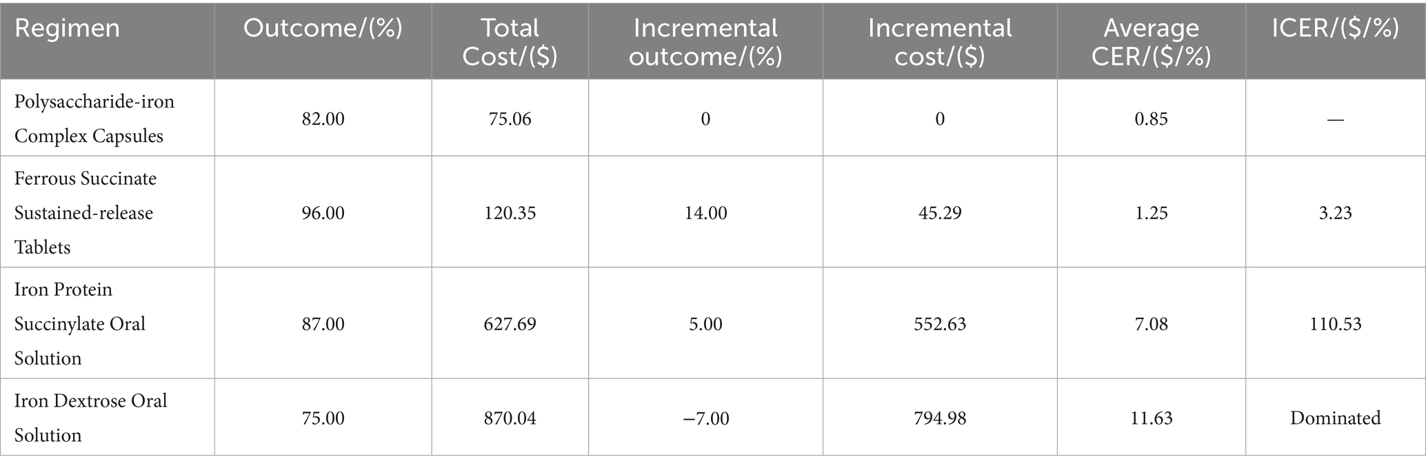 In this study (Table 4), ferrous succinate sustained-release tablets had the lowest ICER at $3.23, meaning the incremental cost per 1% increase in total effective rate was $3.23. This figure is significantly lower than the patient’s WTP threshold of $8,285, making ferrous succinate sustained-release tablets a favorable treatment option. On the other hand, Iron protein succinylate oral solution had a very high ICER of $110.53, while iron dextran oral solution was a dominated strategy, being both more costly and less effective than the comparator.