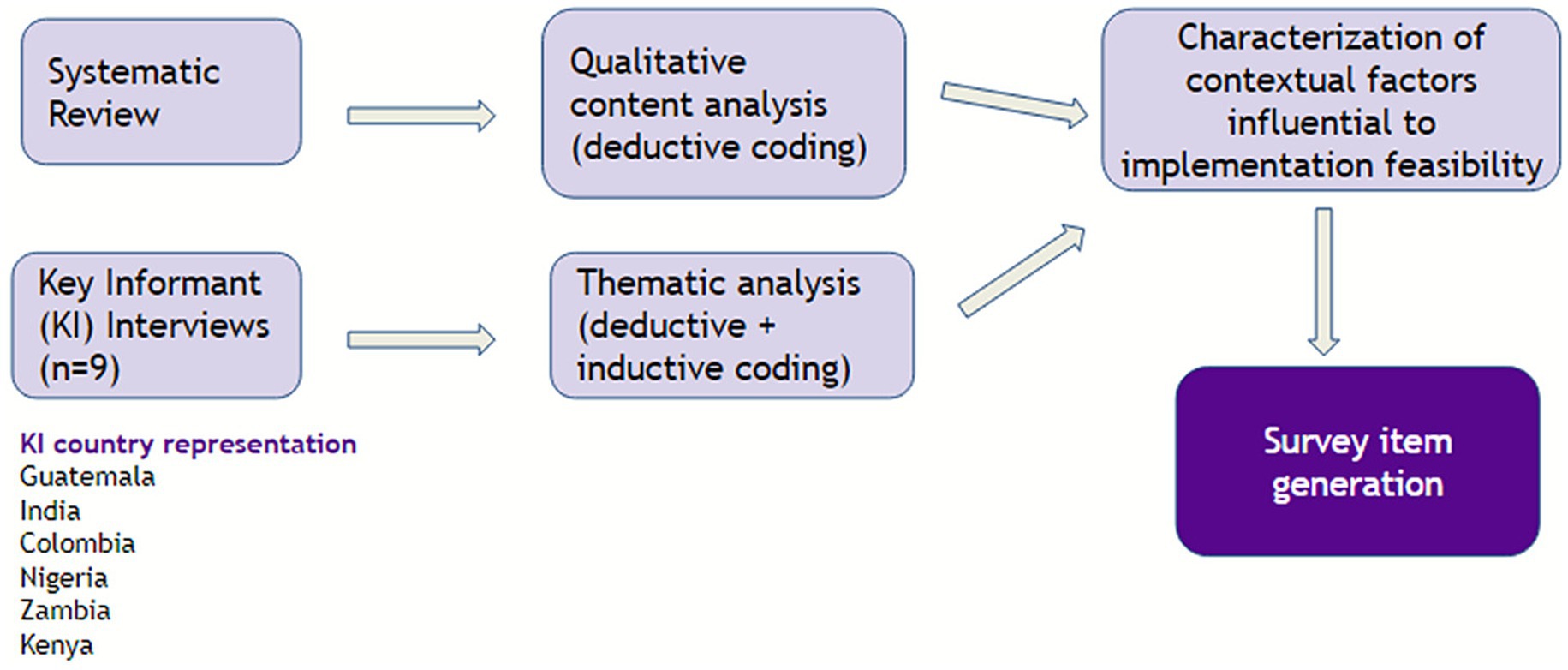 We used deductive and inductive methods to generate survey items from systematic review data and key informant interview transcripts. The systematic review of literature evidence included commonly used definitions of feasibility in implementation science, similar taxonomy and synonyms for feasibility, and commonly reported factors that influence the feasibility of CVD-related EBI. Major databases such as PubMed, Google Scholar were searched for qualifying studies. Nine key informants were interviewed over ZOOM to provide experiential depth to the contextual factors identified from the systematic review and to explore the experts’ perceptions about the concept of feasibility. They occupied roles of principal investigators and co-investigators on CVD research teams, with years of experience in LMIC-context CVD research ranging from 3 to 21 years. The average length of the interviews was 35 min.