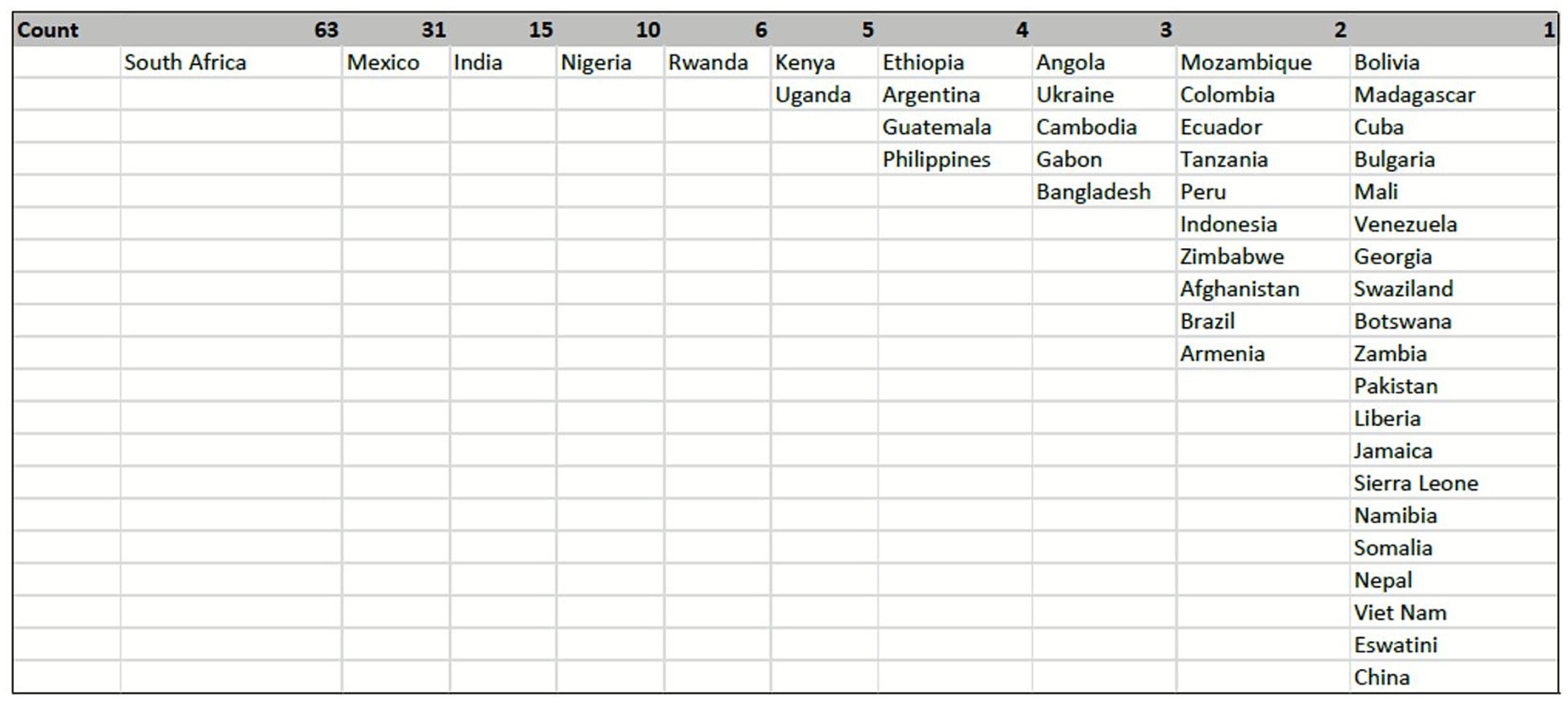 Respondents represented 46 unique LMIC, where the three most represented countries were South Africa (29.2%; 63/216), Mexico (14.5%; 31/216), and India (6.9%; 15/216). The sub-Saharan African region, with 20 countries represented, had the highest number of respondents (53.2%; 115/216) in the survey (see Figure 2).