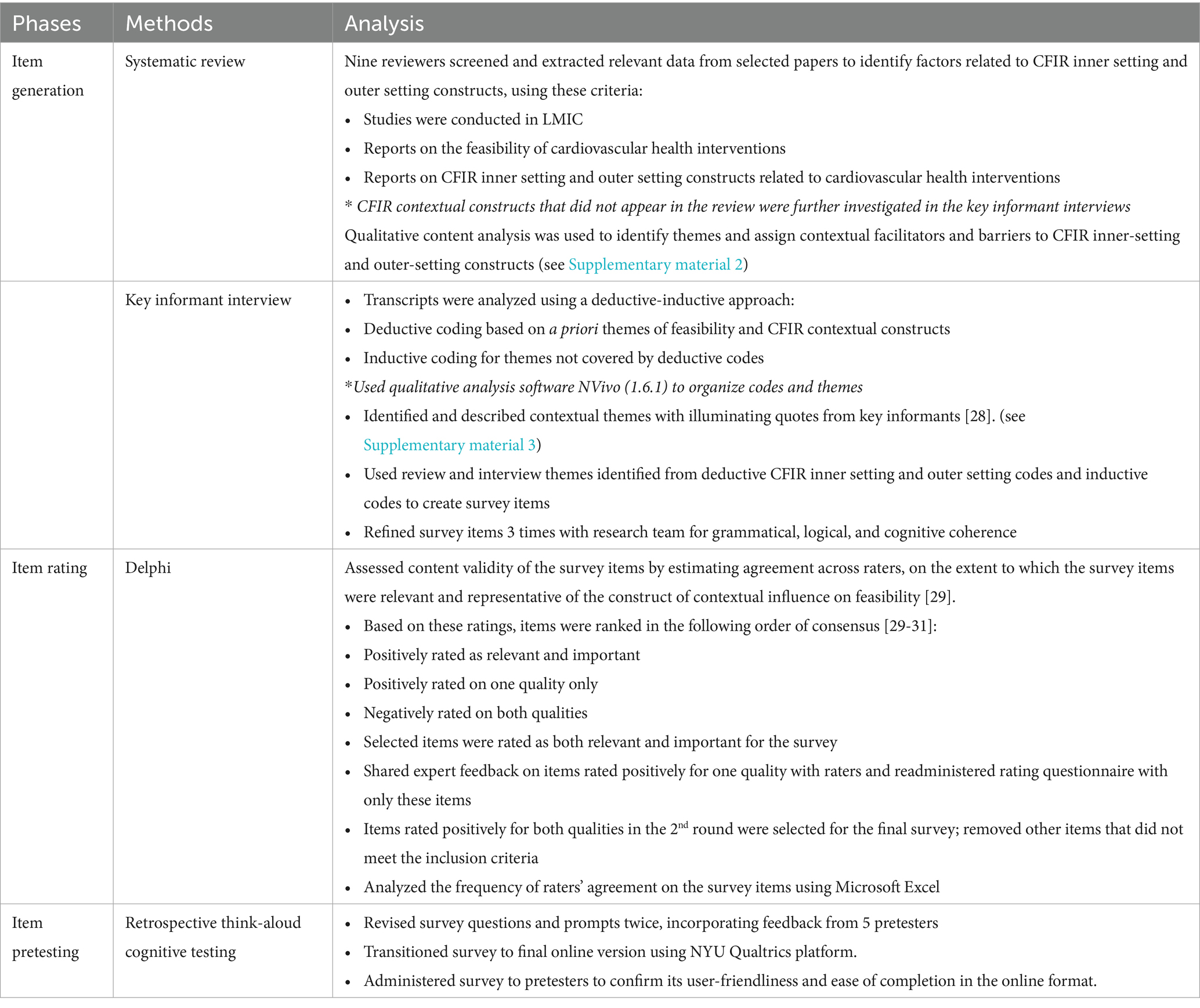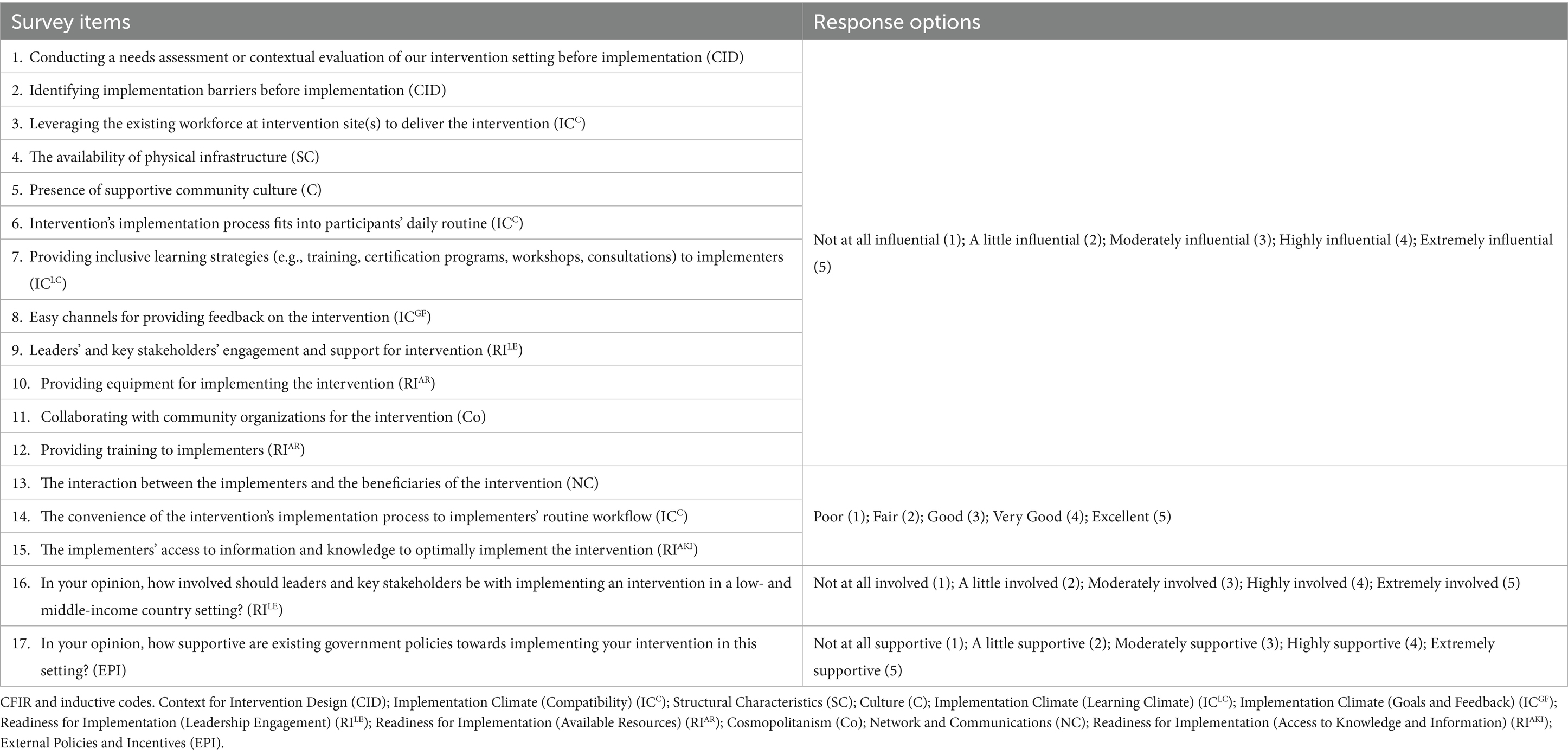 Our survey development process was meticulously executed, focusing on fortifying the psychometric robustness of the survey items to effectively evaluate the CFIR-derived contextual impact on the feasibility of CVD interventions in LMIC. This involved a methodical approach, utilizing CFIR contextual domains to steer our literature search and analyze key informant interviews. By anchoring all surveyed items to available evidence, we ensured their alignment with established knowledge.