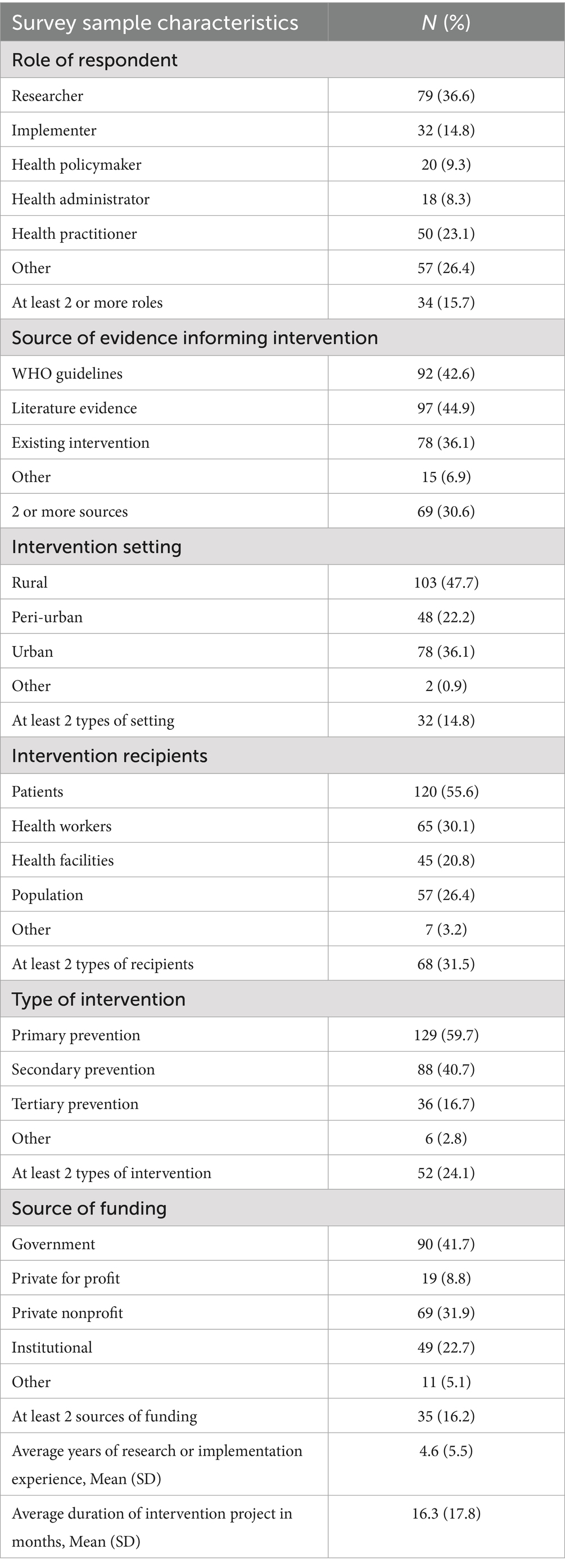 The survey population (N = 216) consisted mainly of CVD researchers (36.6%; 79/216), with 34 respondents who had multiple roles in CVD research and implementation. Approximately 45% (97/216) of respondents reported that literature evidence informed their intervention design and implementation, followed by 43% (92/216) of respondents who used WHO guidelines to inform their interventions. About 31% (69/216) of respondents reported using more than one source of evidence to inform their interventions. About 48% (103/216) of respondents implemented their interventions in rural settings, with 14.8% (32/216) of interventions occurring in more than one type of demographic setting. Most respondents (55.6%; 120/216) reported being involved in patient-level interventions, with 31.5% (68/216) of respondents reporting interventions that targeted more than one type of intervention recipient such as interventions targeting both patients and healthcare workers Most of the interventions (59.7%; 129/216) provided or supported the primary prevention of CVD, with 24.1% (52/216) of interventions addressing more than one dimension (primary, secondary, and tertiary) of CVD prevention. About 41% (90/216) of respondents received government funding for their work, and 16.2% (35/216) received funding from multiple sources besides the government. Respondents averaged 4.5 years (SD: 5.5 years) of CVD research or implementation experience, with their most recent intervention lasting an average of 16.3 months (SD: 17.8 months) (see Table 3).