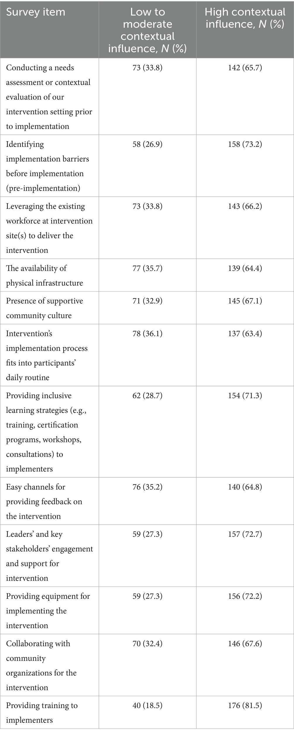 From the Delphi process, only 5 items emerged from the survey items that captured the extent of influence and respondents’ quality rating of a few CFIR-coded contextual factors. These items were leadership and stakeholder engagement (Readiness for Implementation); the convenience of the implementation process to implementer’s routine workflow (Implementation Climate); and access to inclusive learning programs to provide information and knowledge to support implementation (Implementation Climate, Readiness to Implementation). There was a significant association between the extent of influence the intervention’s implementation fit with participants’ daily routine and how convenient the implementation process was with the implementers’ routine workflow (p = 0.008); other associations between these 5 items were insignificant.