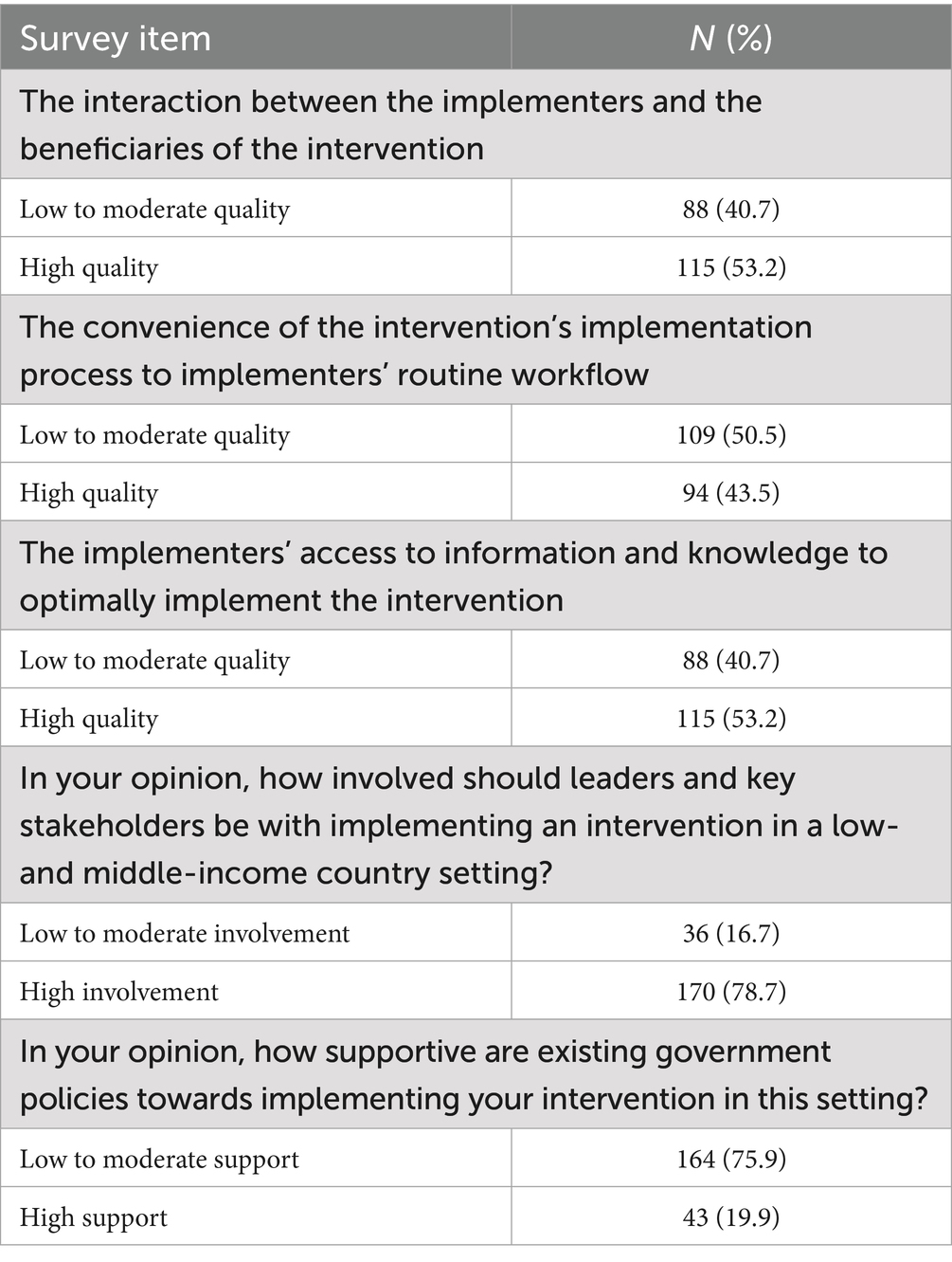 More respondents reported having a high quality of interaction between implementers and intervention beneficiaries (53.2%; 115/216); implementers’ access to useful information and knowledge to aid implementation (53.2%; 115/216); and an expectation of leaders and stakeholders to be highly involved in implementation efforts (78.7%; 170/216). On the other hand, more respondents reported having low to moderate quality (50.5%; 109/216) in the convenience of the implementation process to implementers’ routine workflow and low to moderate support (75.9%; 164/216) from existing government policies for their interventions in the LMIC settings (see Table 5).