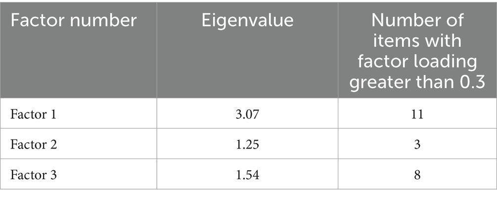 Factor analysis and identification using EFA produced three factors, where the cutoff of Eigenvalue was set at 1 or greater. After the initial round of EFA, we used uniqueness (a measure of an item’s variance that is not shared with other items) to eliminate one survey item (‘influence of leadership and stakeholder engagement…’) as it had the highest uniqueness value of 0.57 out of 1 of all 12 items. The second round of EFA with 11 survey items produced three factors with Eigenvalues greater than 1 and collectively explaining 82.31% of the total variance observed in the analysis—a value improved upon after removing the item with the highest uniqueness (40). In the third round of EFA, where item uniqueness was employed as a criterion for elimination, there was no enhancement observed in the overall variance, as determined by the Eigenvalue cutoff set at 1.0. Consequently, we opted to adhere to the factors delineated in the preceding second round of EFA. We also set a cutoff of 0.30 or greater for the factor loading of an item, to qualify that item as belonging to a factor (see Tables 6, 7).